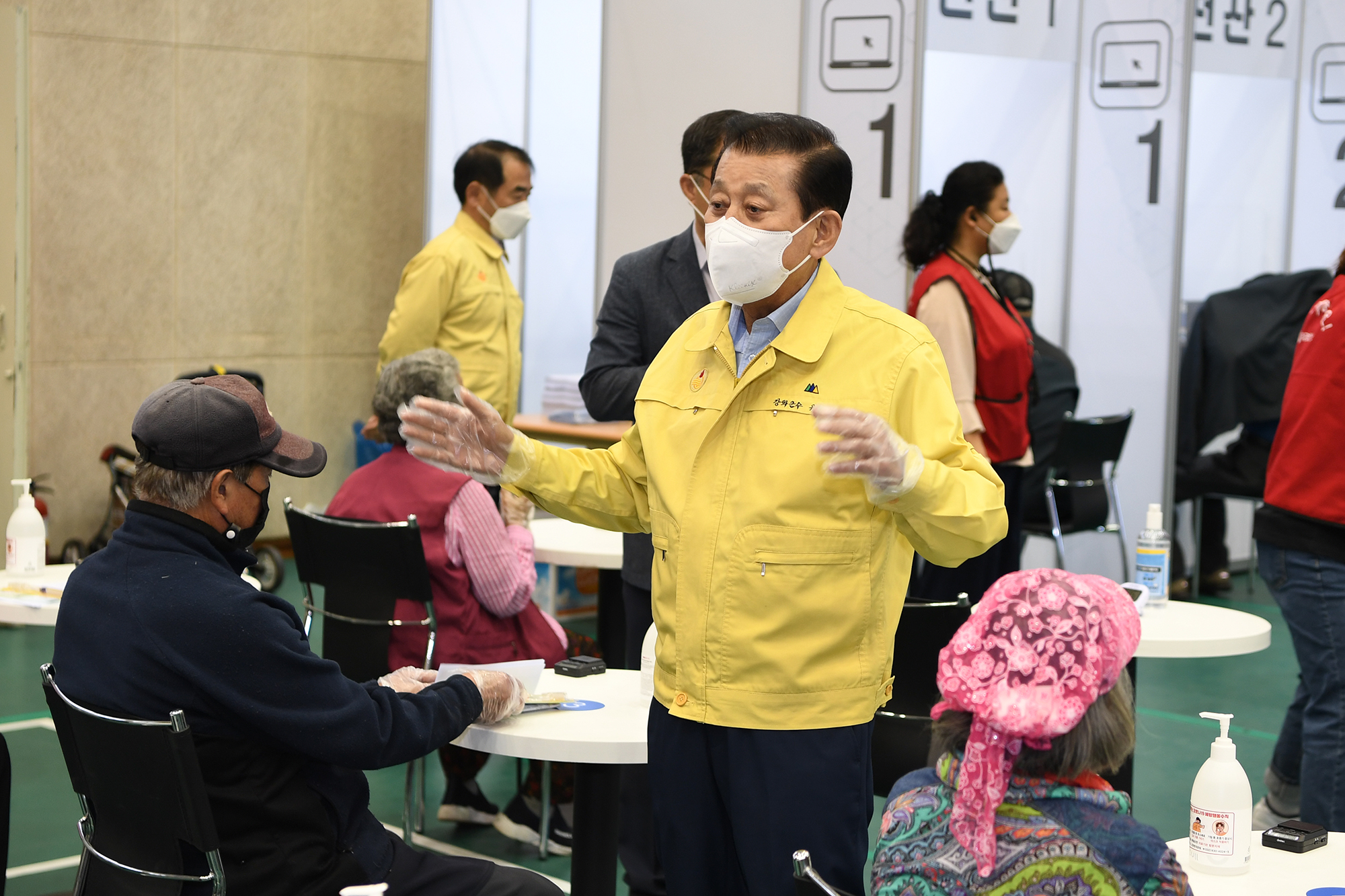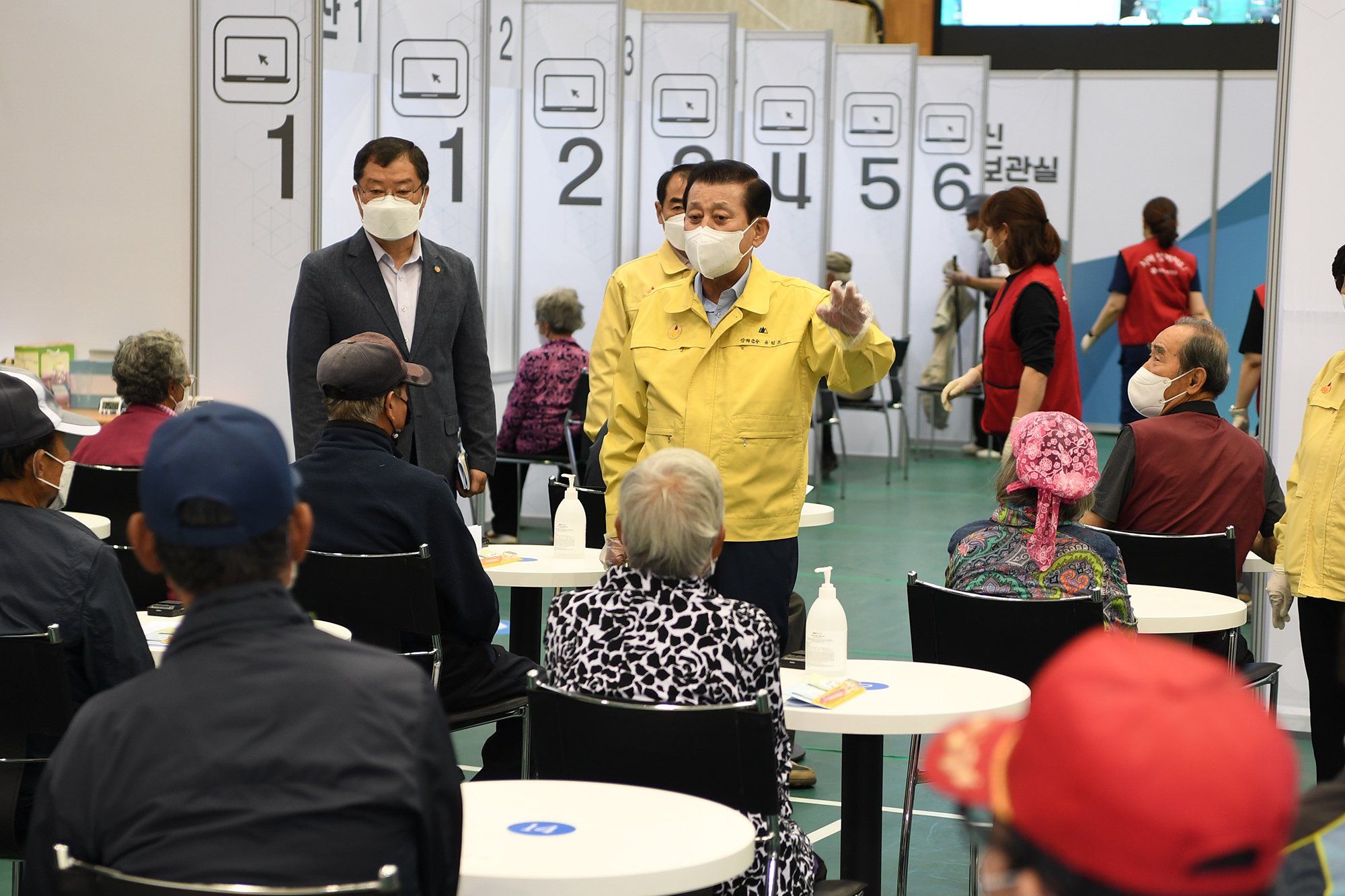 또한, 어르신들의 원활한 접종과 이동 편의를 제공하기 위해 셔틀버스 6대를 투입해 읍·면별 접종일정에 맞춰 시간당 2대씩 하루 최대 21회 운행을 하고, 공무원들은 버스에 선탑해 승‧하차 및 백신센터 내에서의 이동을 도왔다. 백신센터에는 거동이 불편한 어르신을 위해 휠체어를 충분히 배치하고, 문턱과 계단은 걸려 넘어지지 않도록 경사로로 만들었다.