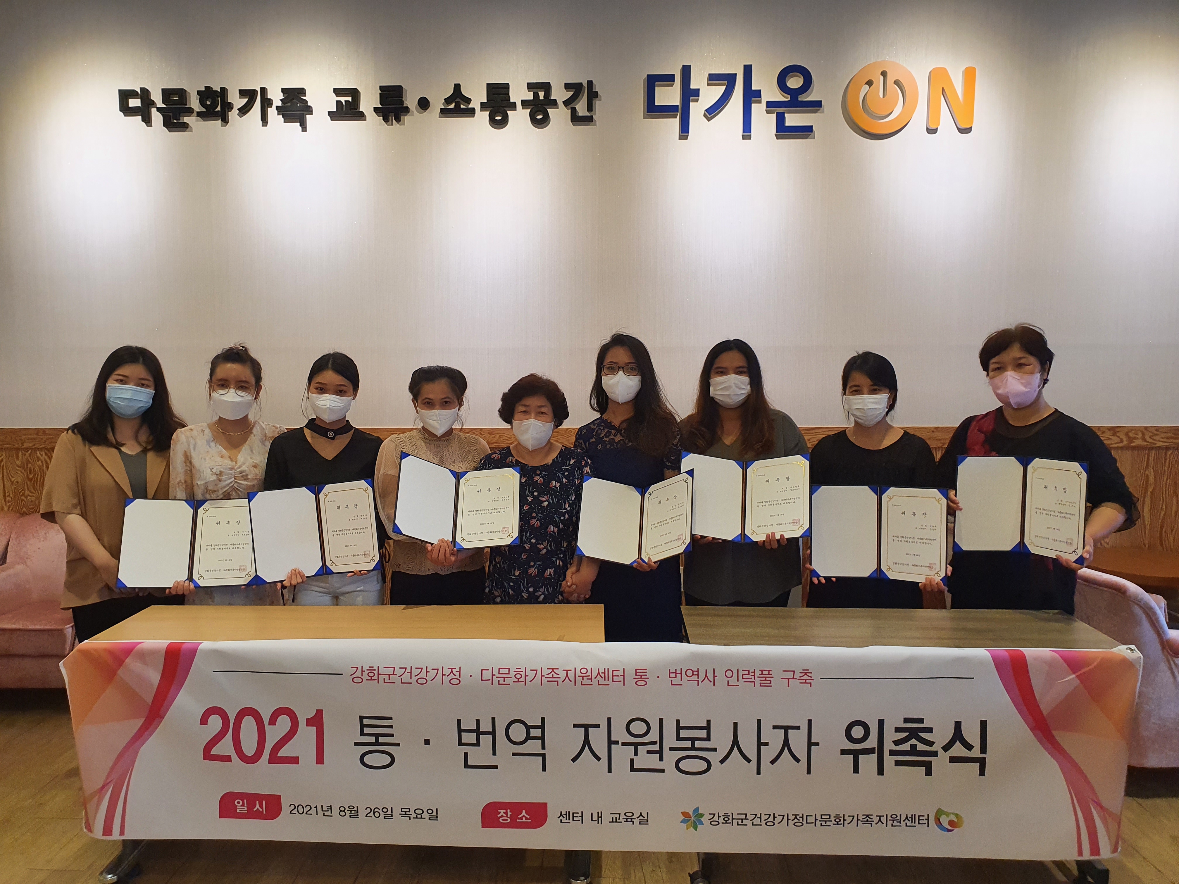 강화군건강가정‧다문화가족지원센터(센터장 임경숙, 이하 센터)는 지난 26일 결혼이민자 등으로 구성된 10명의 통번역자 원봉사자 인력풀을 구축하고 위촉식을 가졌다.