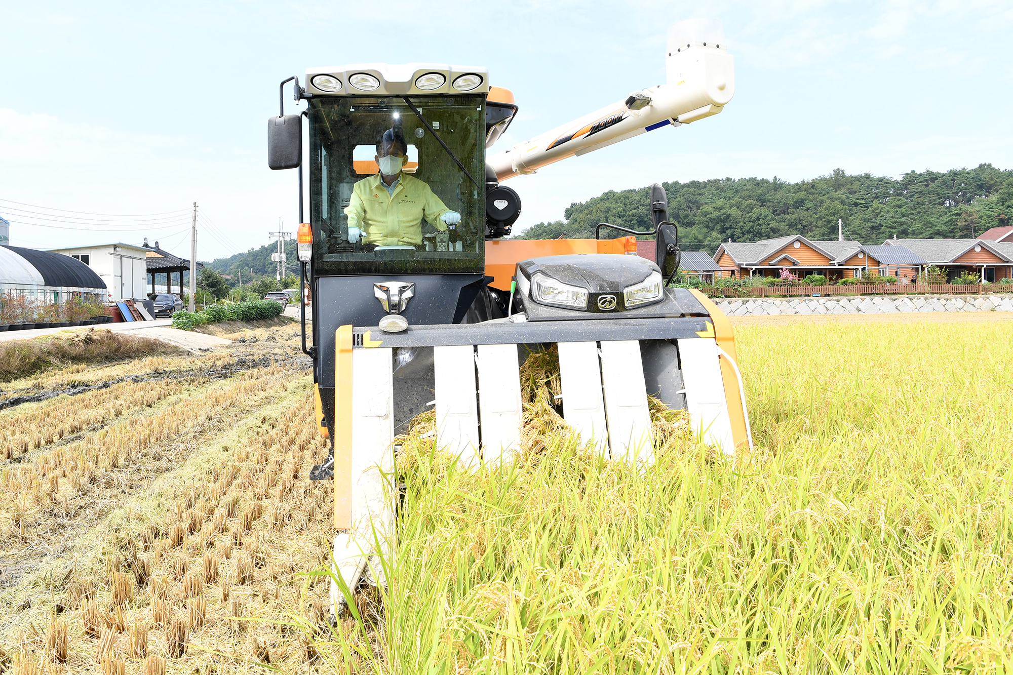 이날 유천호 군수는 직접 콤바인에 탑승해 벼베기를 시연했다. 시연 후 긴 가뭄과 폭염을 이겨낸 땀의 결실을 첫 수확하는 농가의 노고를 격려하고 수확의 기쁨을 함께 나눴다.