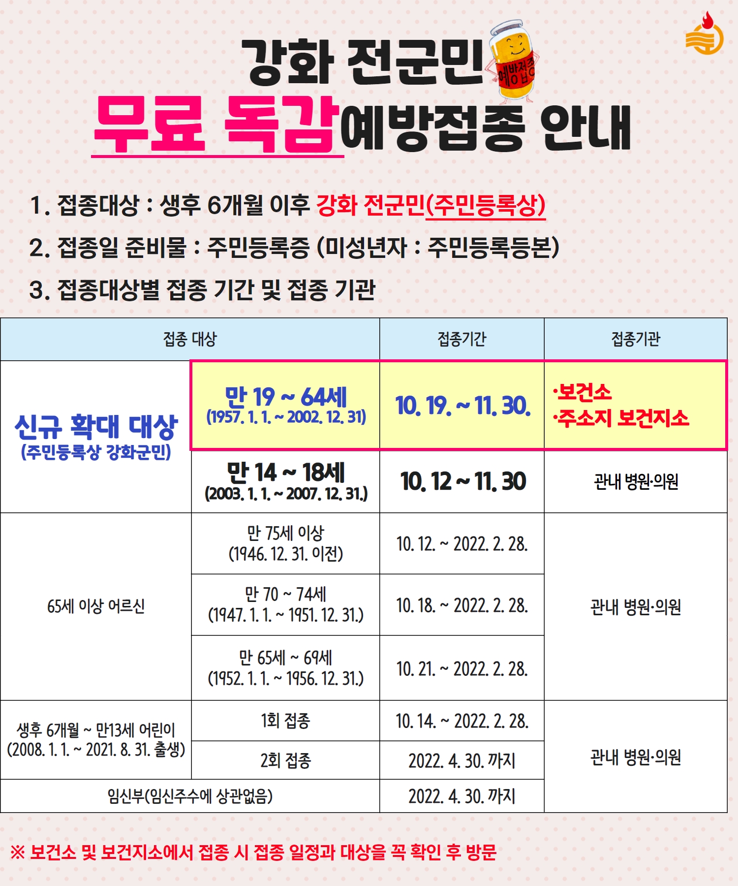 만19~64세 군민, 군 보건소 및 보건지소에서 무료 접종