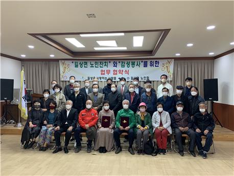 이날 협약식은 앞으로 진행할 프로젝트에 양 단체간의 적극적인 협조를 통해 길상면 발전과 화합을 도모하고자 마련된 자리로 길사모 회원들과 길상면 노인회장 30여명이 참석한 가운데 이루어졌다.