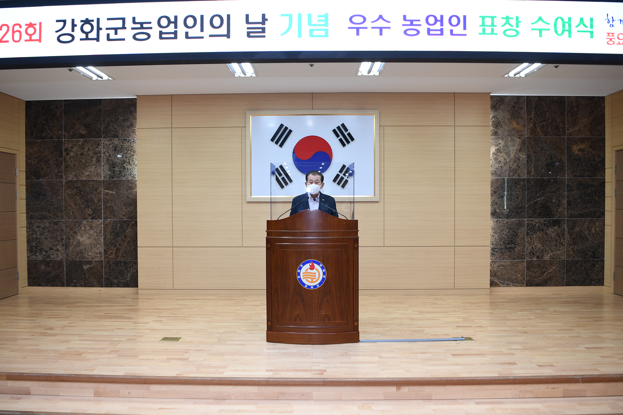 ‘강화군농업인의 날’은 농업의 중요성을 인식시키고 농업인의 사기 진작과 자긍심 고취를 위해 매년 11월 11일에 개최하는 기념행사이다. 코로나19 확산 예방을 위해 지난해에 이어 행사를 축소해 농업인을 격려했다.