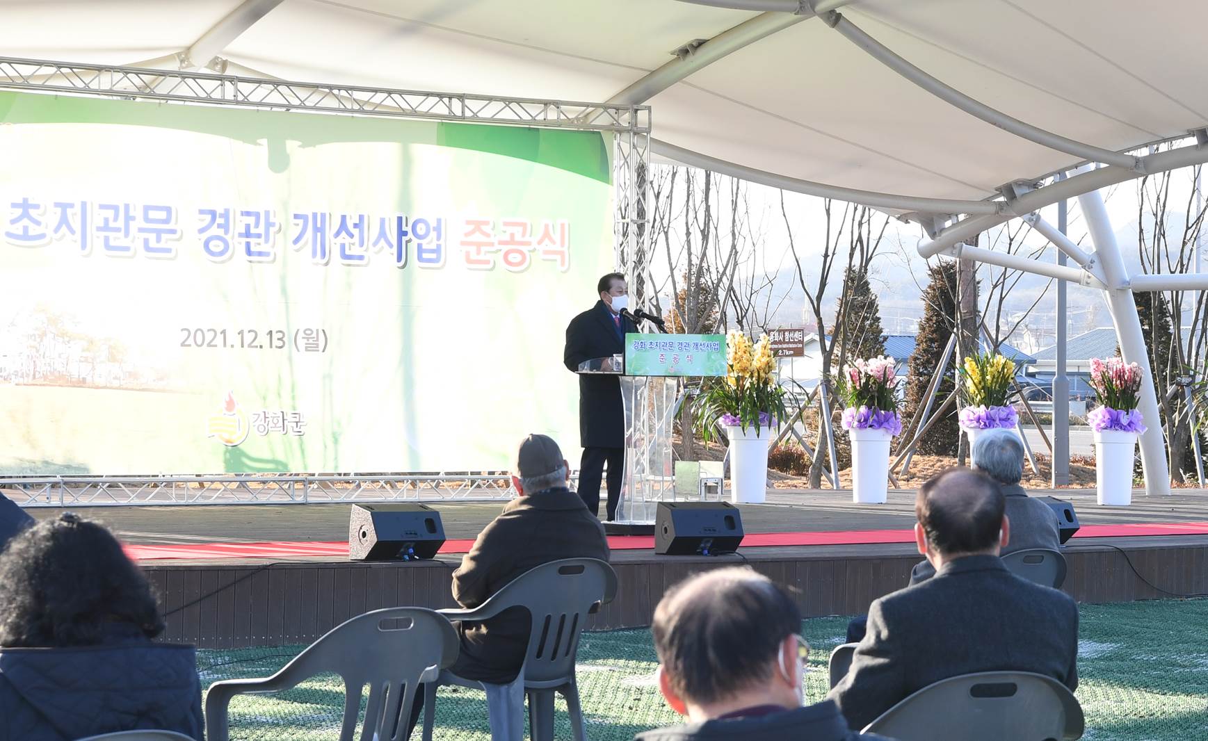 군은 13일 초지대교 진입관문 경관개선을 위한 ‘강화 초지관문 경관개선사업’을 완료하고 준공식을 개최했다. 이날 준공식에는 유천호 군수, 신득상 군의장 및 의원, 유관 기관단체장 등 200여 명이 참석해 준공을 축하했다. 정부방역지침에 따라 발열체크, 참석자 명부작성, 행사장 방역소독 등 방역수칙을 철저하게 준수한 가운데 개최됏다.
