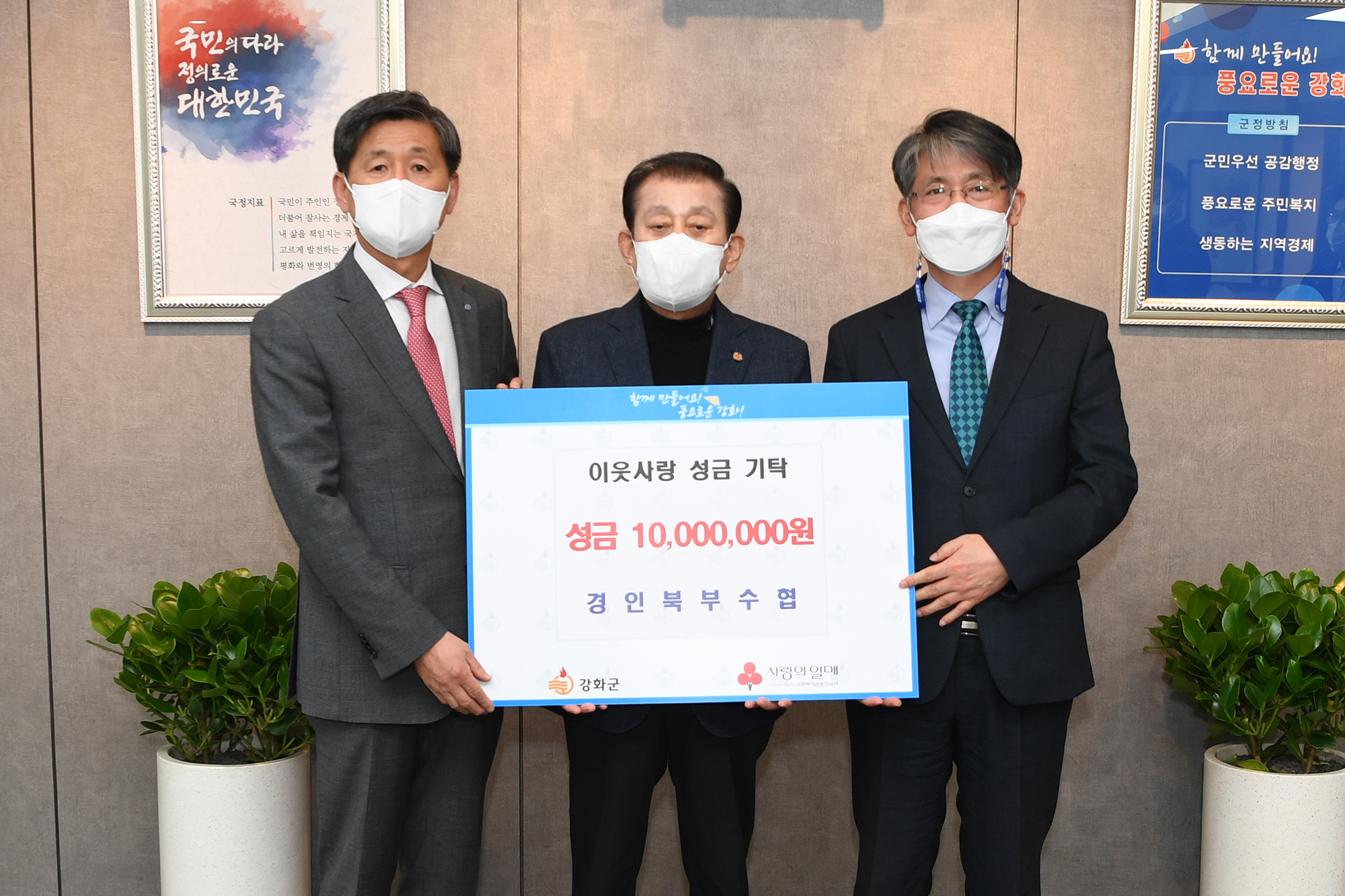 강화군은 지난 15일 경인북부수협(조합장 이만식)에서 연말연시 이웃사랑 성금 1,000만 원을 기탁했다고 밝혔다.