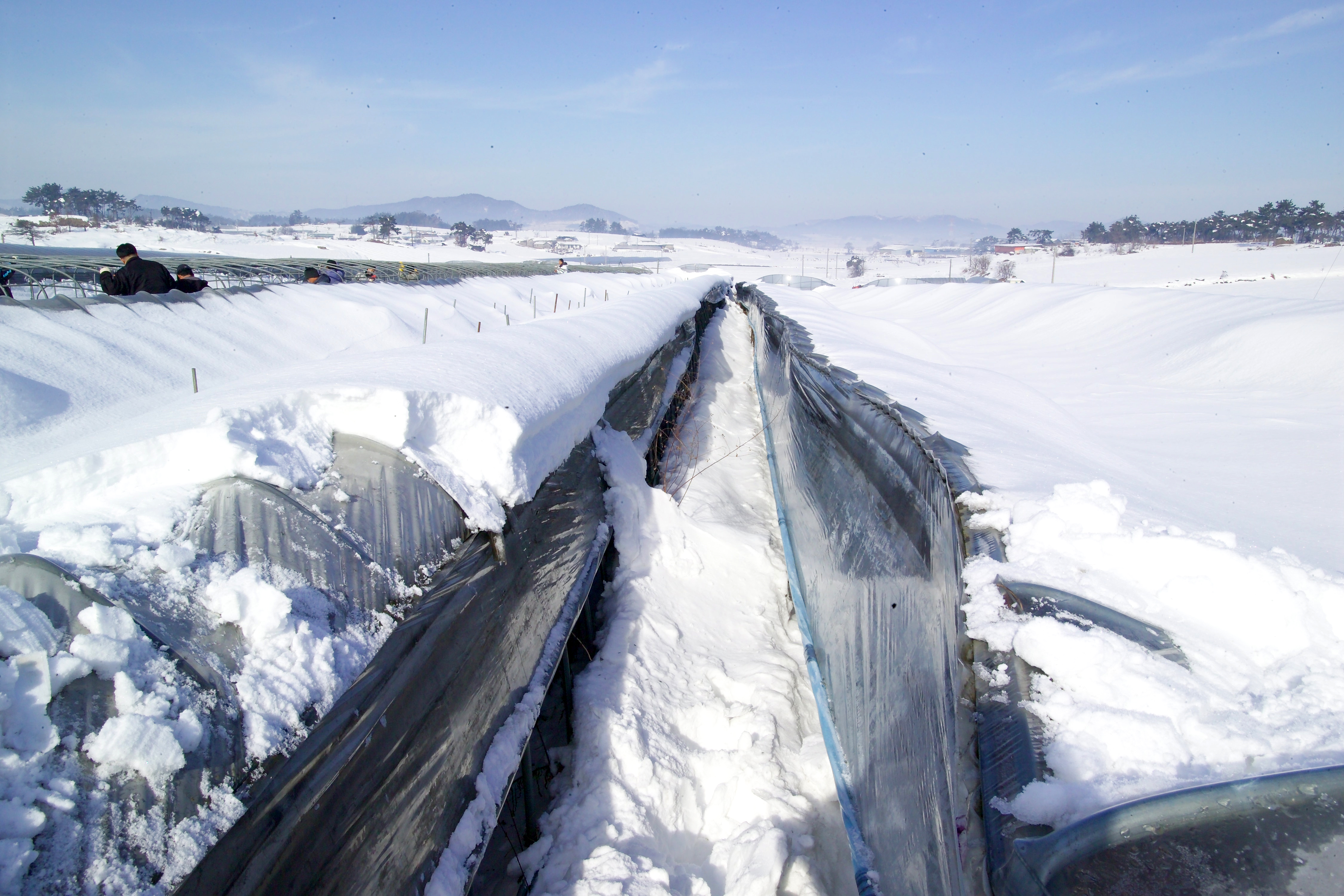 우선, 폭설 시 비닐하우스 지붕에 눈이 쌓이기 전에 미리미리 쓸어내려주되 안전에 유의해야 한다. 눈 제거 작업이 어려울 경우에는 온풍기를 가동해 하우스 내부에서 지붕의 눈이 녹아내리도록 해야 피해를 줄일 수 있다. 또한, 하우스 안으로 녹은 물이 스며들지 않도록 배수로를 사전에 정비해 습해를 받지 않도록 해야 한다.