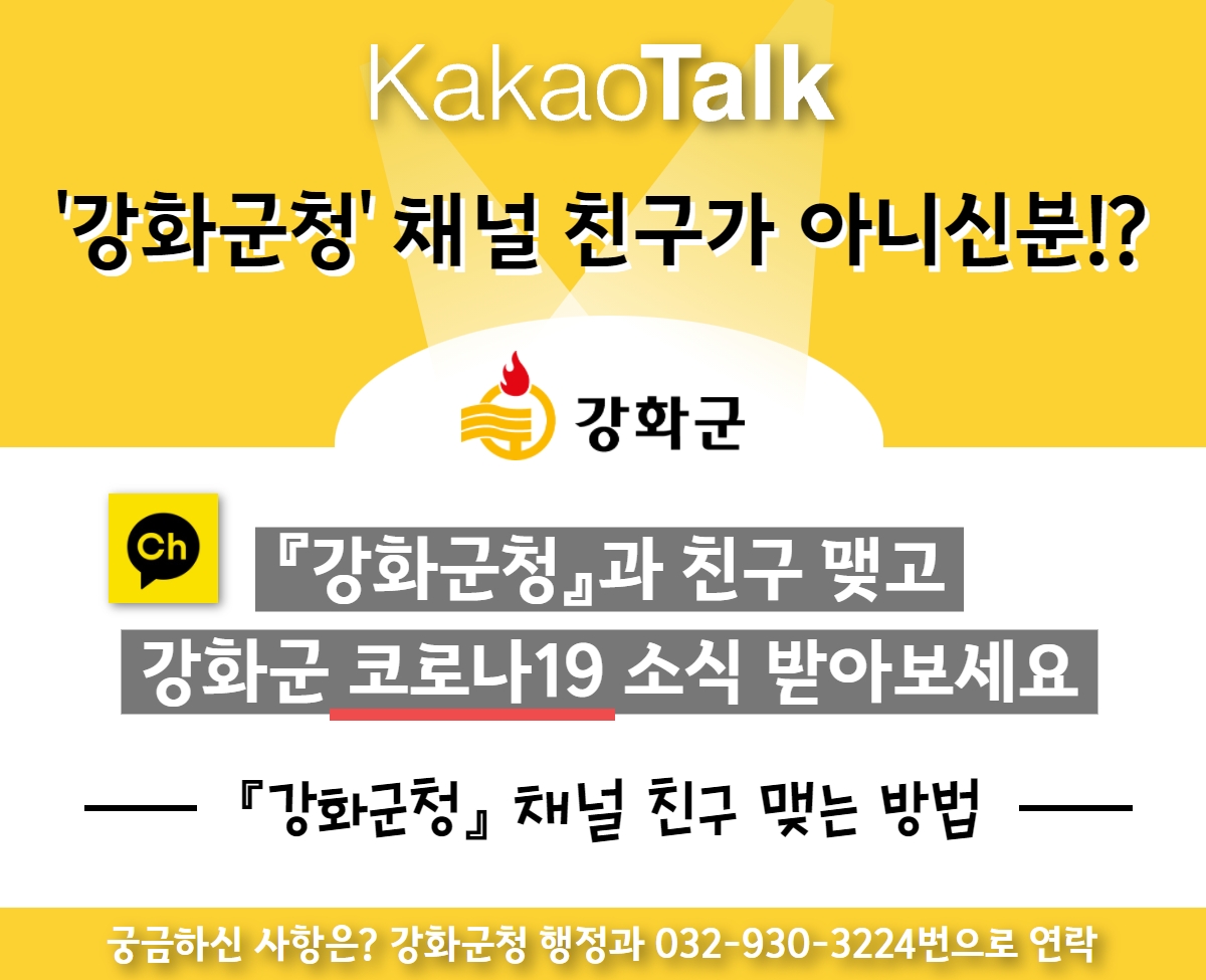 한편, 군은 블로그, 인스타그램, 페이스북 등 기존 SNS에 익숙하지 않은 어르신 등의 정보 취약계층의 사각지대 해소를 위해 ‘강화군청 카카오채널’을 지난 2019년 개설해 현재 군민의 40%인, 2만 7천여 명이 구독하고 있다. 구독은 ‘카카오톡’에 접속해 우측 상단 검색창에서 ‘강화군청’을 검색해 ‘채널 추가하기’를 누르면 된다.
