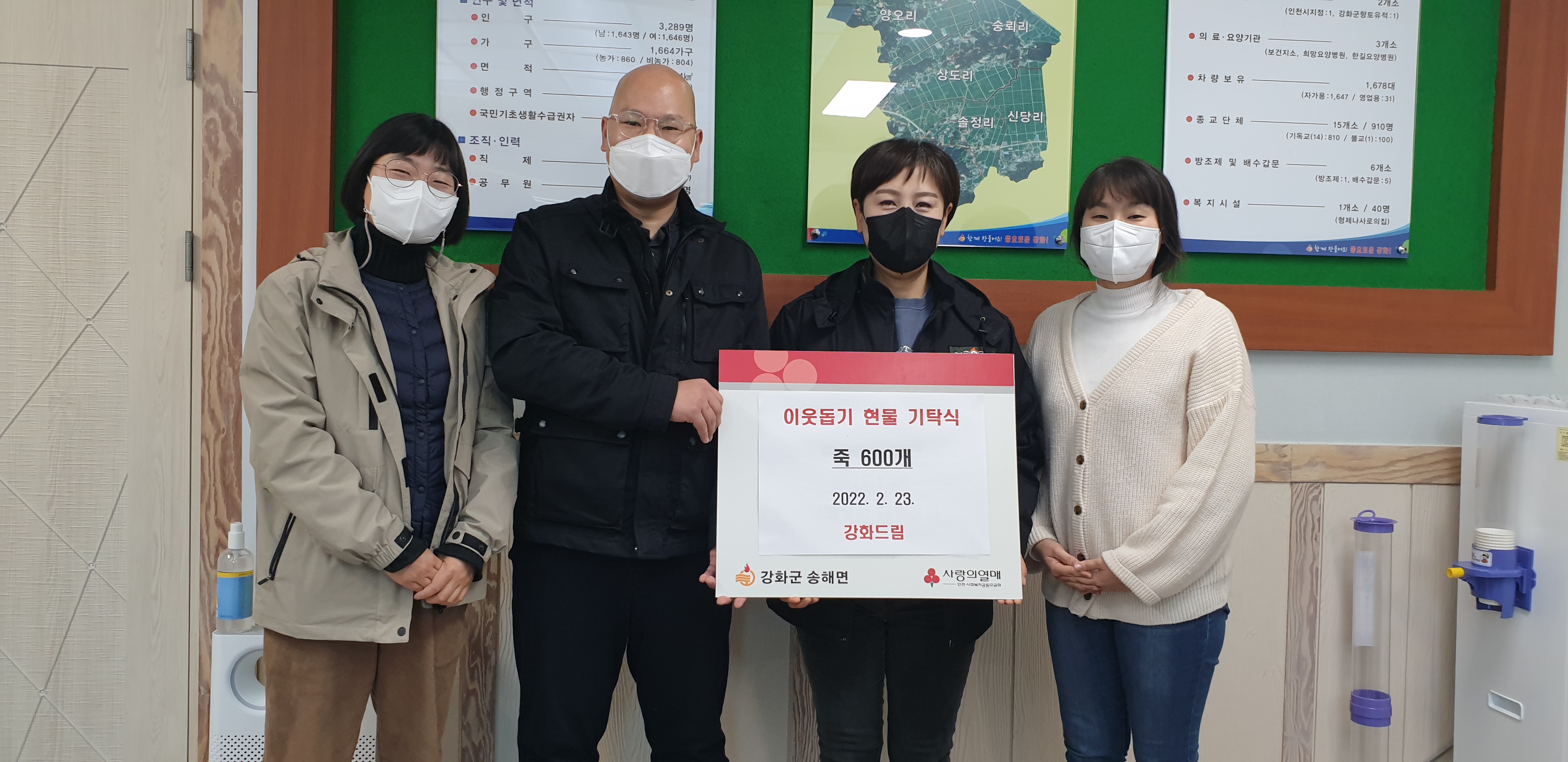 강화군 관내 업체 강화드림(대표 한성희)은 지난 23일 송해면사무소를 방문해 지역의 어려운 이웃들에게 전달해달라며 영양죽 600개를 기탁했다.