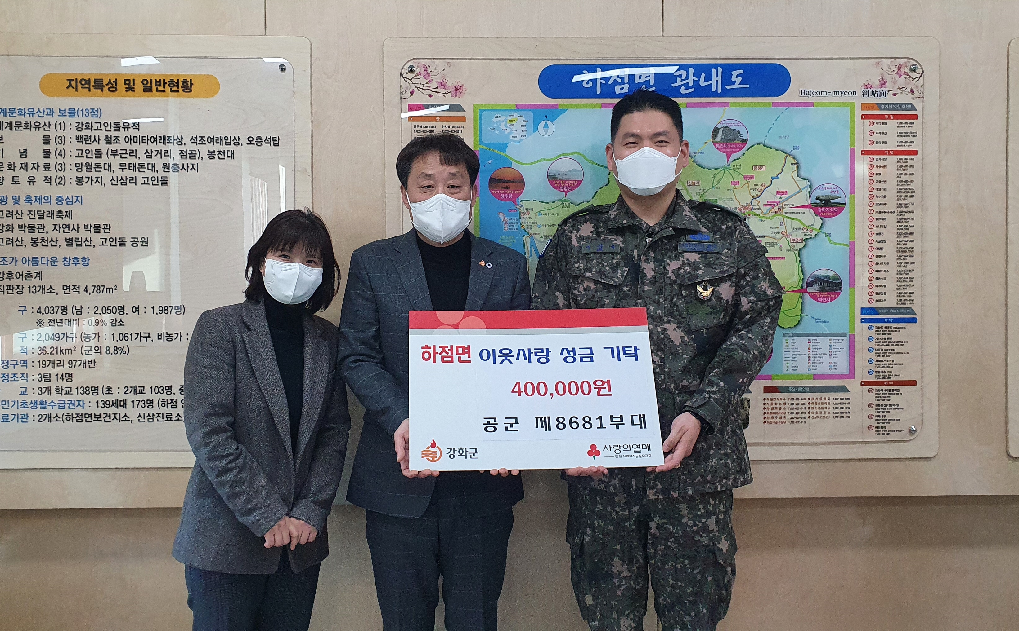 공군 제8681부대는 전체 부대원들이 이웃돕기 성금을 조금씩 모아 매년 명절마다 하점면사무소를 통해 이웃돕기를 실천하고 있다.