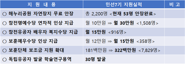 또한, 참전유공자 가족의 복리증진을 위해 사망 참전유공자의 배우자 복지수당을 신설해 올해부터 월 15만 원씩 지급하고 있다. 그동안 참전유공자의 유족들은 전몰군경, 상이군경, 무공수훈 등 다른 국가유공자 유족과 달리 법률상 보훈자격이 승계되지 않아 본인이 사망하면 명예수당이 중단됐다.
