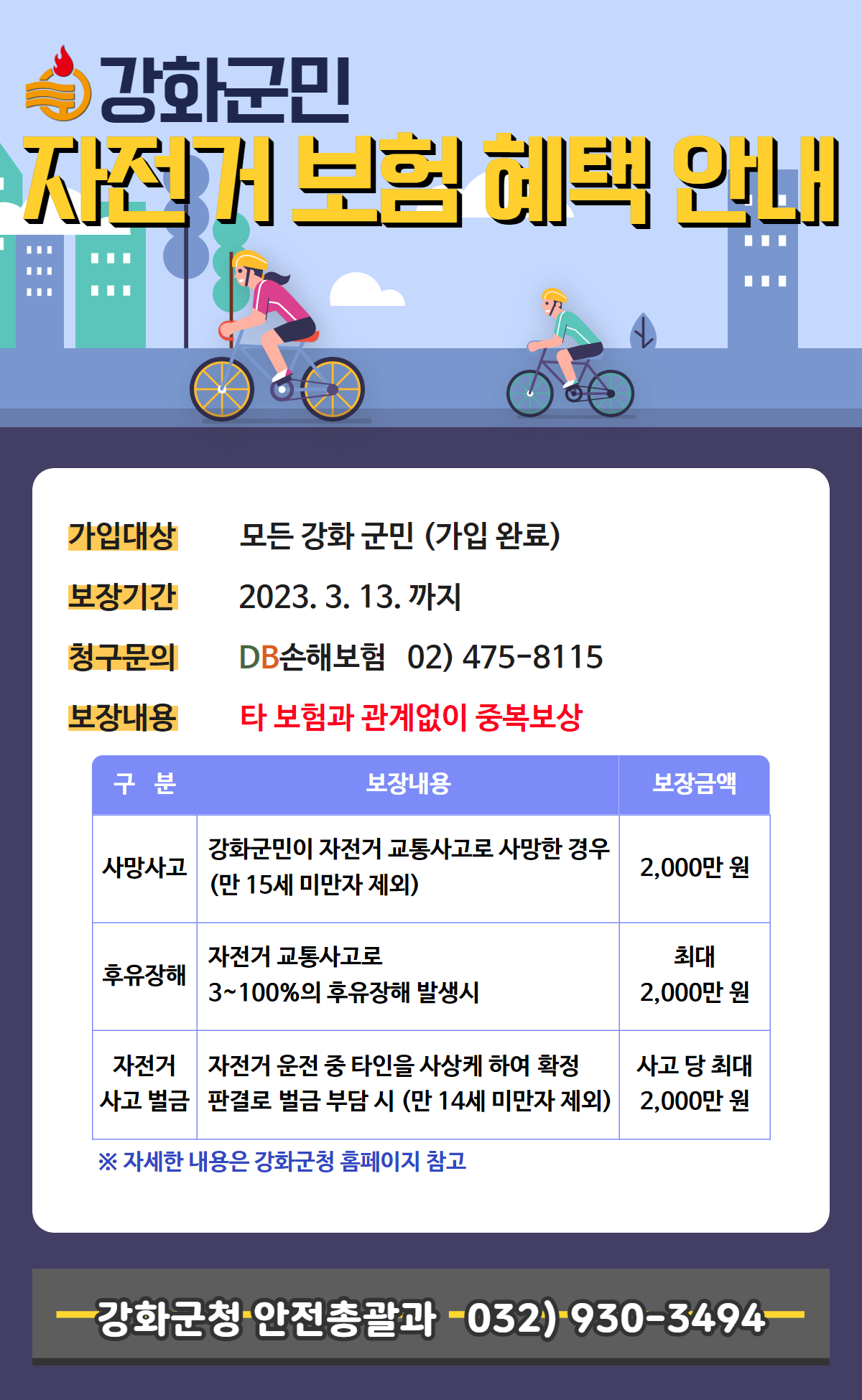 자전거보험은 강화군에 주민등록을 두고 있는 군민은 누구나 별도 절차 없이 자동 가입된다. 보장기간은 2023년도 3월 13일까지로 국내 다른 지역에서 발행한 사고에 대해서도 보장을 받는다.