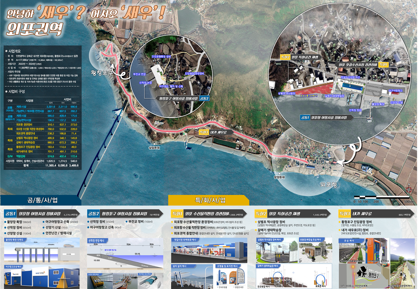 올해 선정된 ‘외포권역(외포항․황청항)’ 어촌뉴딜사업에는 116억 원을 투입해 외포항에는 물양장 확장, 어구어망창구 신축, 선양기 및 선양장 조성이 추진되며, 황청항에는 선착장 및 부잔교를 정비하고 어구어망창고가 신설된다. 또한, 외포항 포토존 정비, 바다쉼터 조성, 수산물직판장 새우젓 상징 특화, 삼별초 역사광장 정비 등을 위해 기본 계획을 수립하고 있다.