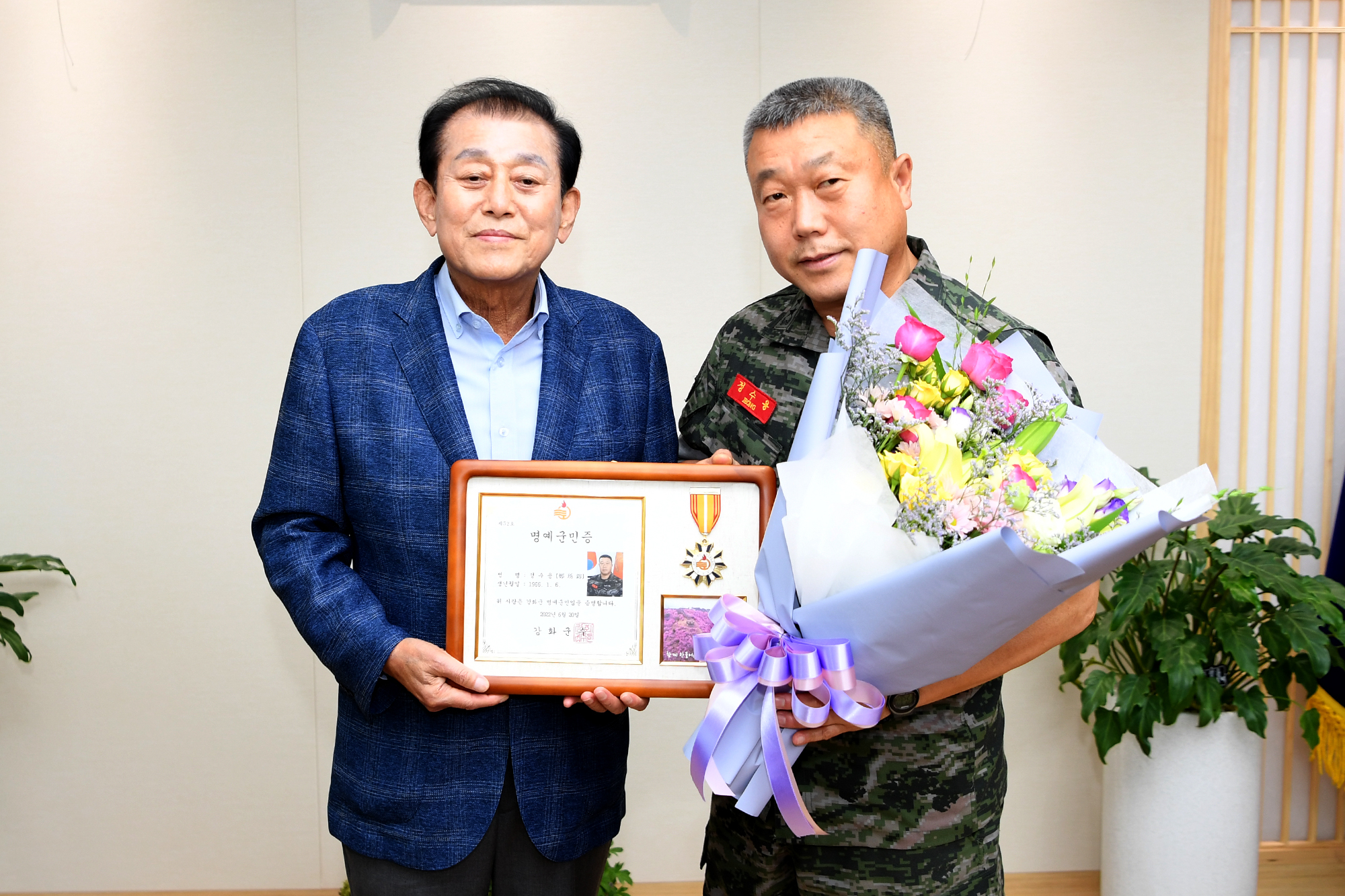 강화군, 정수용 해병대 제2사단장에 명예군민증 전달