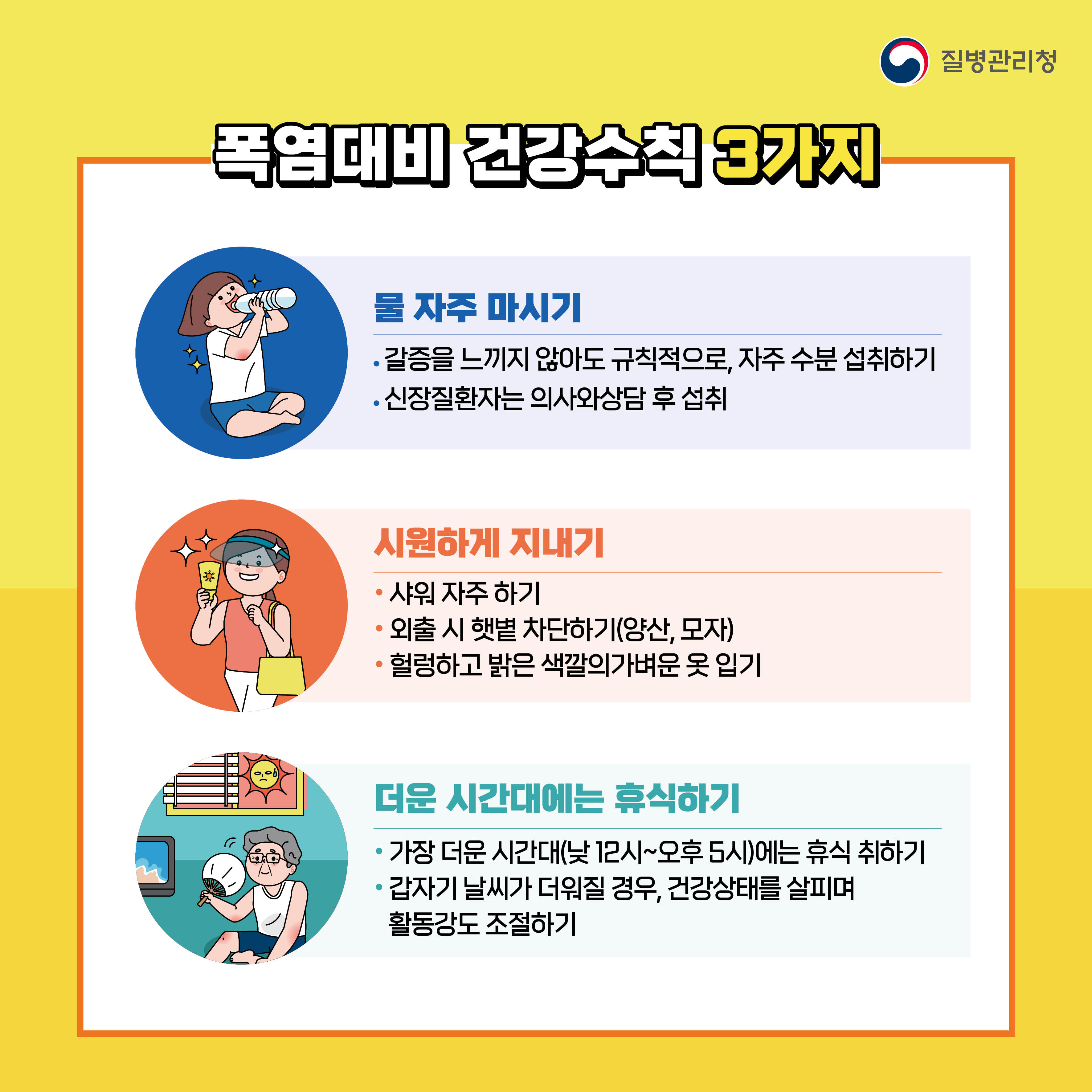폭염 시 실외활동 자제, 충분한 수분 섭치 등 건강수칙 준수