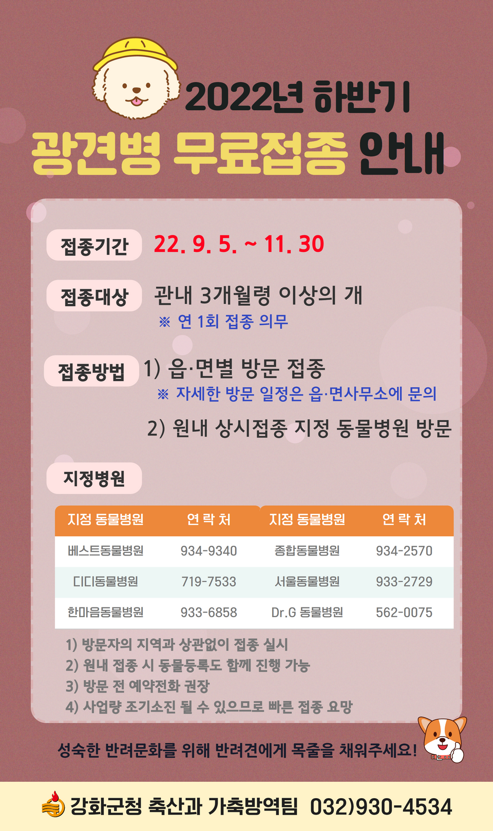접종 대상은 생후 3개월 이상 반려견이다. 기타 자세한 내용은 강화군 축산과(☎032-930-4534)로 문의하면 된다.