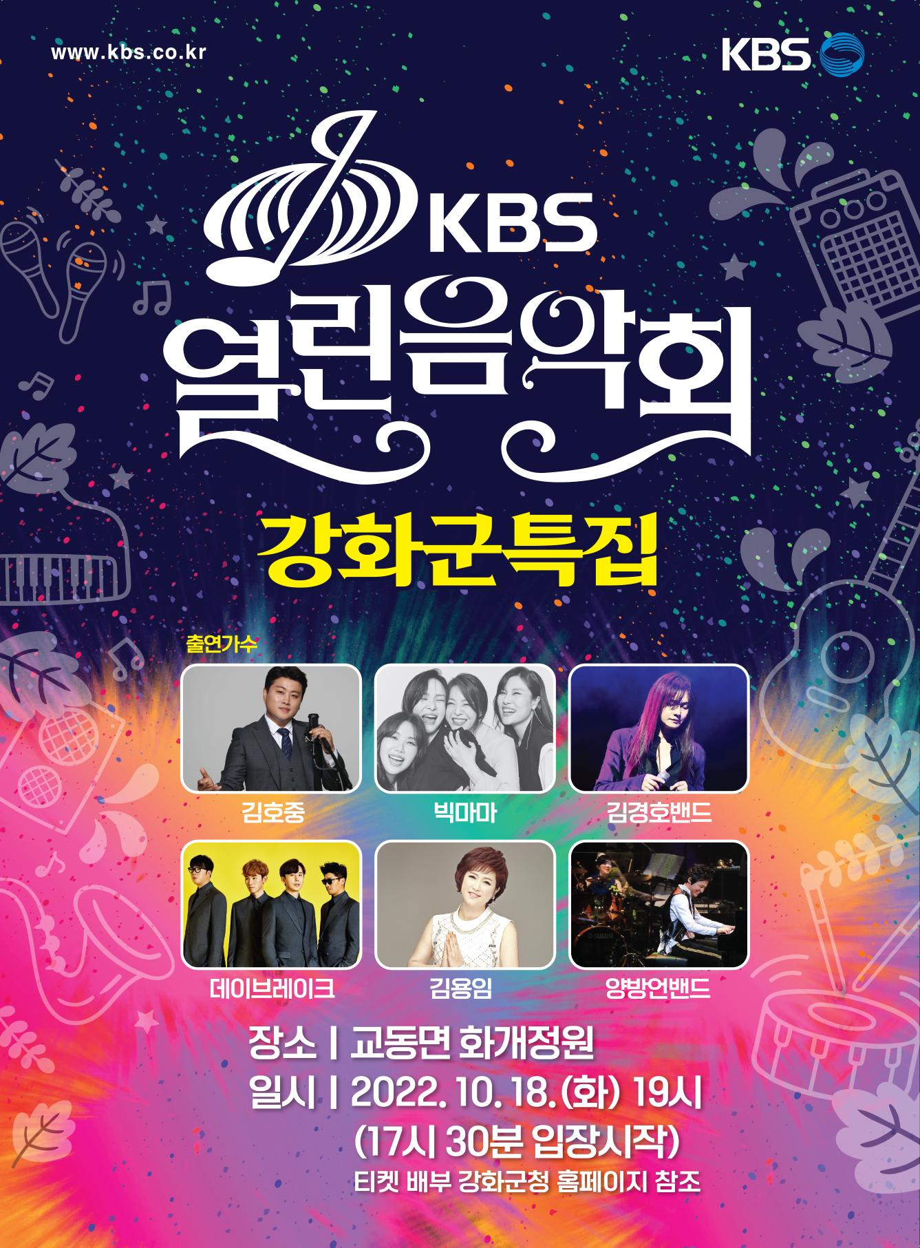군민과 함께하는 가을 축제인 ‘KBS 열린음악회’는 개장을 앞둔 교동도 화개정원에서 열린다. 이번 음악회는 접경지역인 평화의 섬 교동도에서 실향민들을 위로하고, 전 국민과 함께 다시 한번 평화의 의미를 되새길 수 있는 기회를 마련하기 위해 준비됐다.