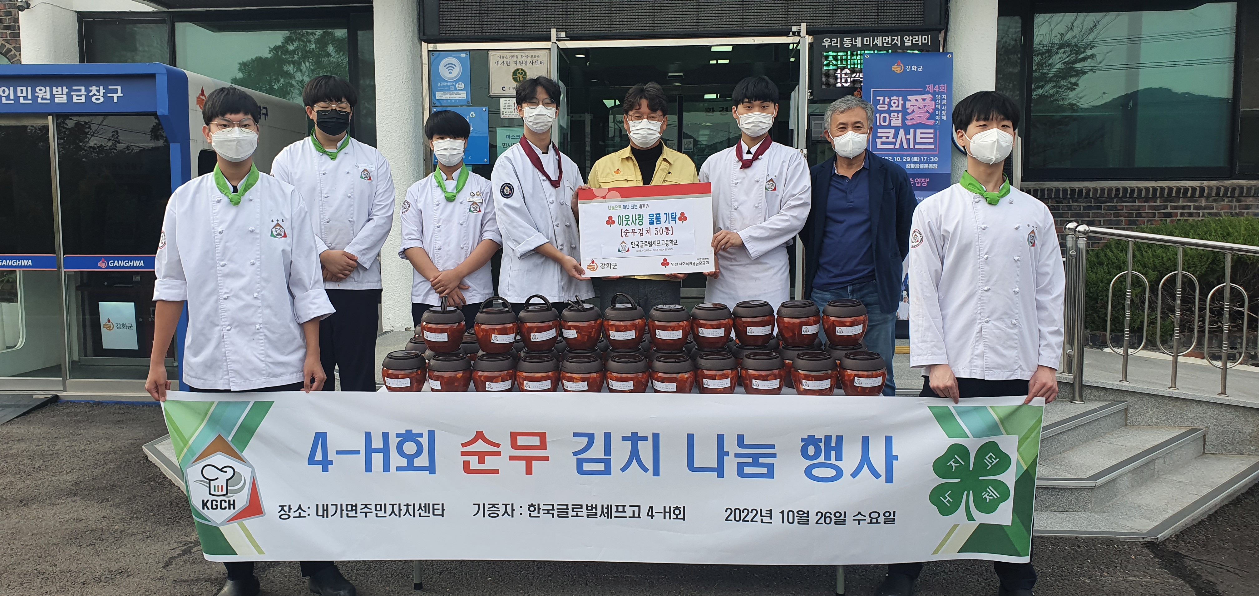 강화군 내가면(면장 차은석)은 지난 26일 한국글로벌셰프고등학교 4-H회 동아리 학생들이 직접 만든 순무김치 50통을 기탁했다.