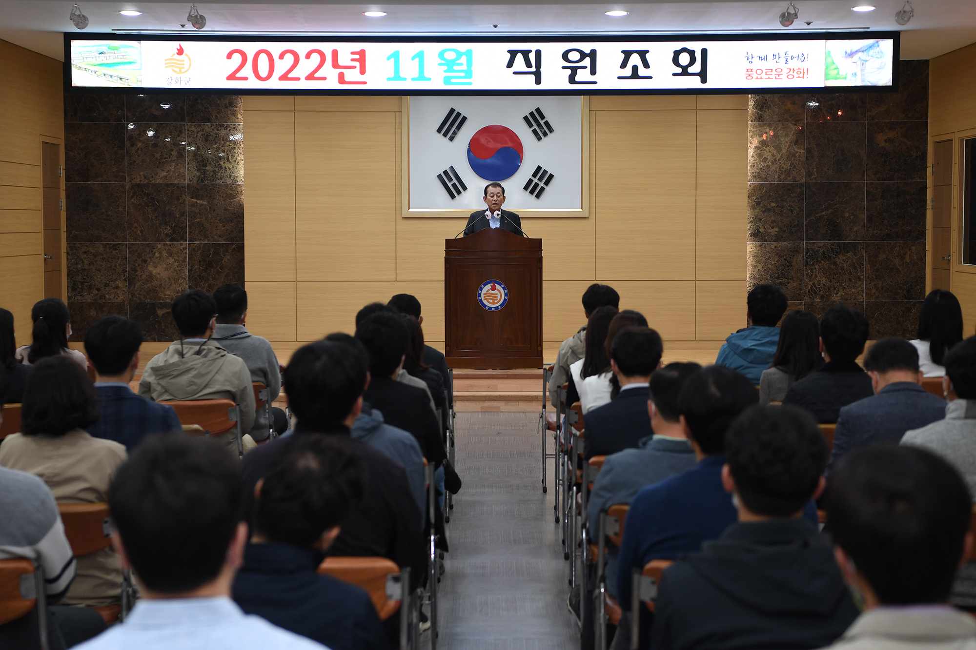 강화군(군수 유천호)이 1일 ‘11월 직원조회’를 개최했다. 유천호 군수를 비롯한 전 직원은 이태원 참사를 애도하기 위해 검은 리본을 가슴에 달고 직원조회에 참석했다.