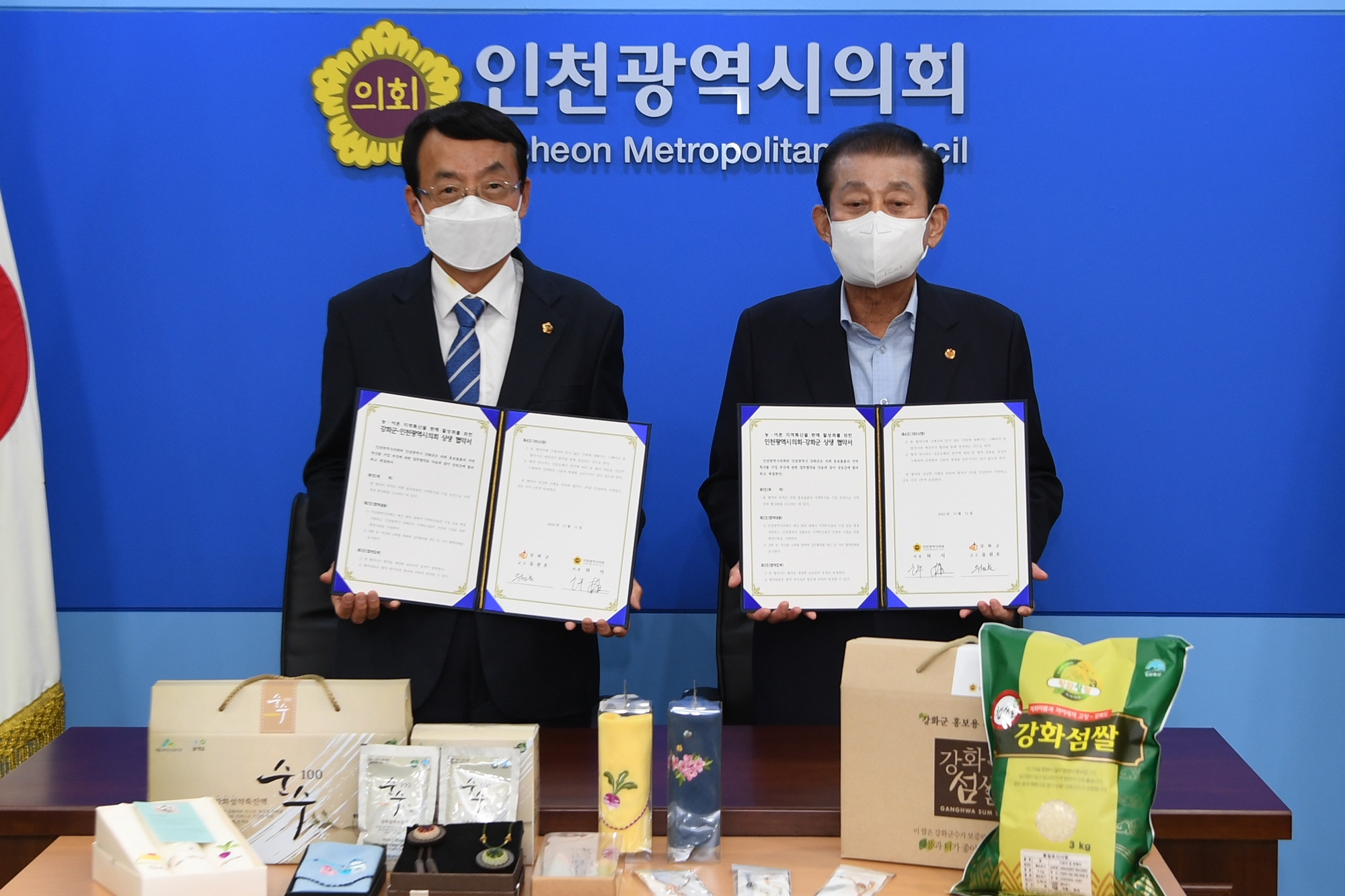 이날 유천호 군수, 인천시의회 헉식 의장 및 박용철 시의원이 참석한 가운데 시의회 홍보물품 구매에 강화군 지역 특산품을 우선 구매해 사용하기로 하는 내용의 협약서에 서명했다.
