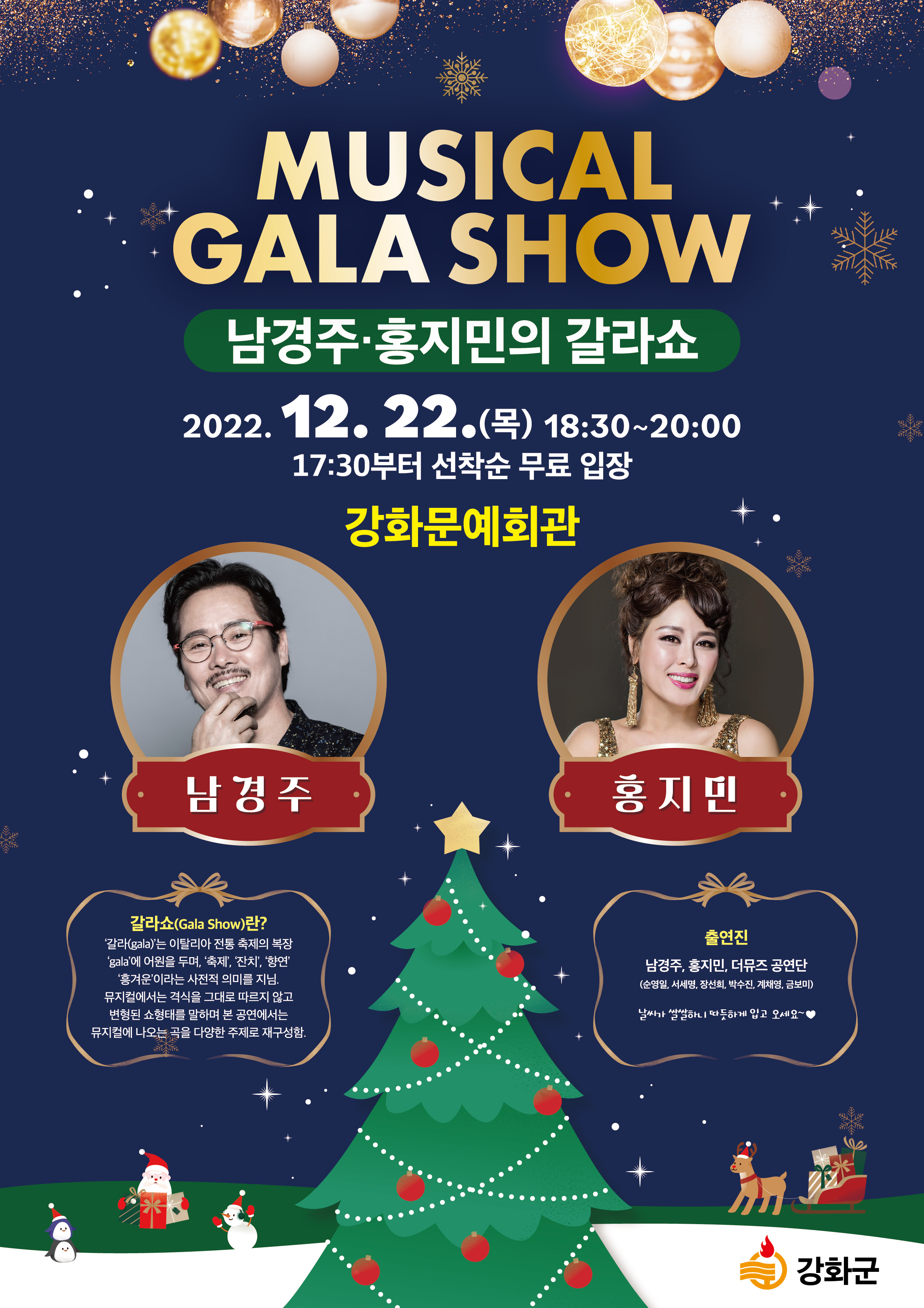 강화군(군수 유천호)은 오는 22일(목) 18시 30분에 강화문예회관에서 국내 인기 뮤지컬 배우 남경주와 홍지민이 함께하는 ‘2022 강화 뮤지컬 갈라쇼’를 개최한다.