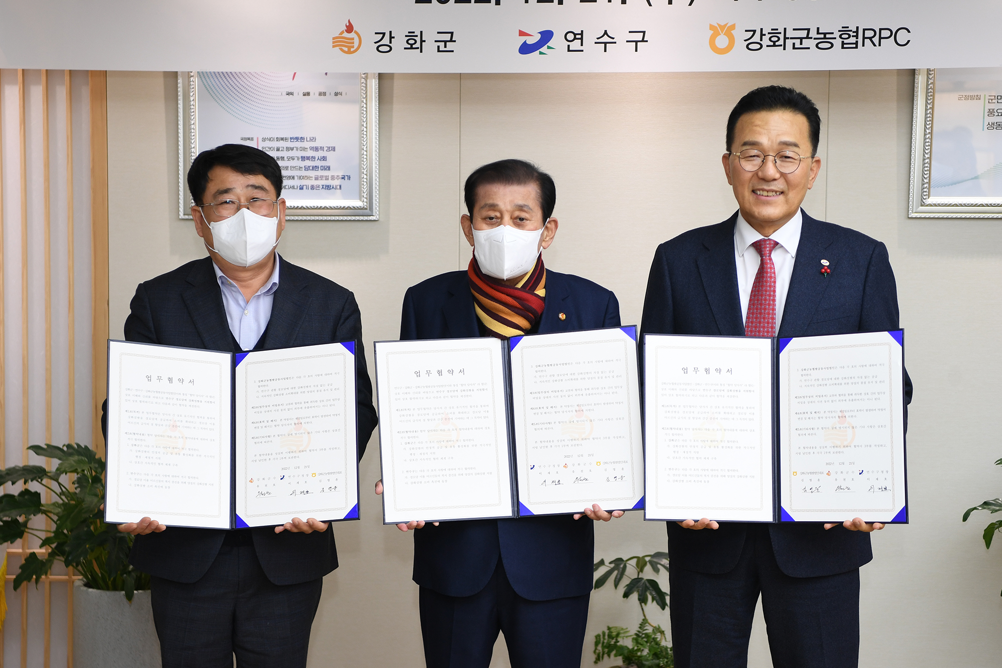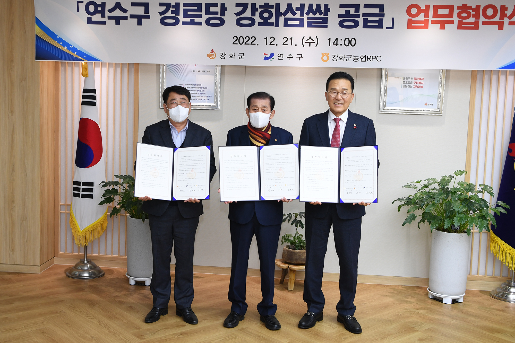 강화군(군수 유천호)과 연수구(구청장 이재호)는 21일 ‘연수구 경로당 강화섬쌀 공급’을 위한 업무협약식을 개최했다.