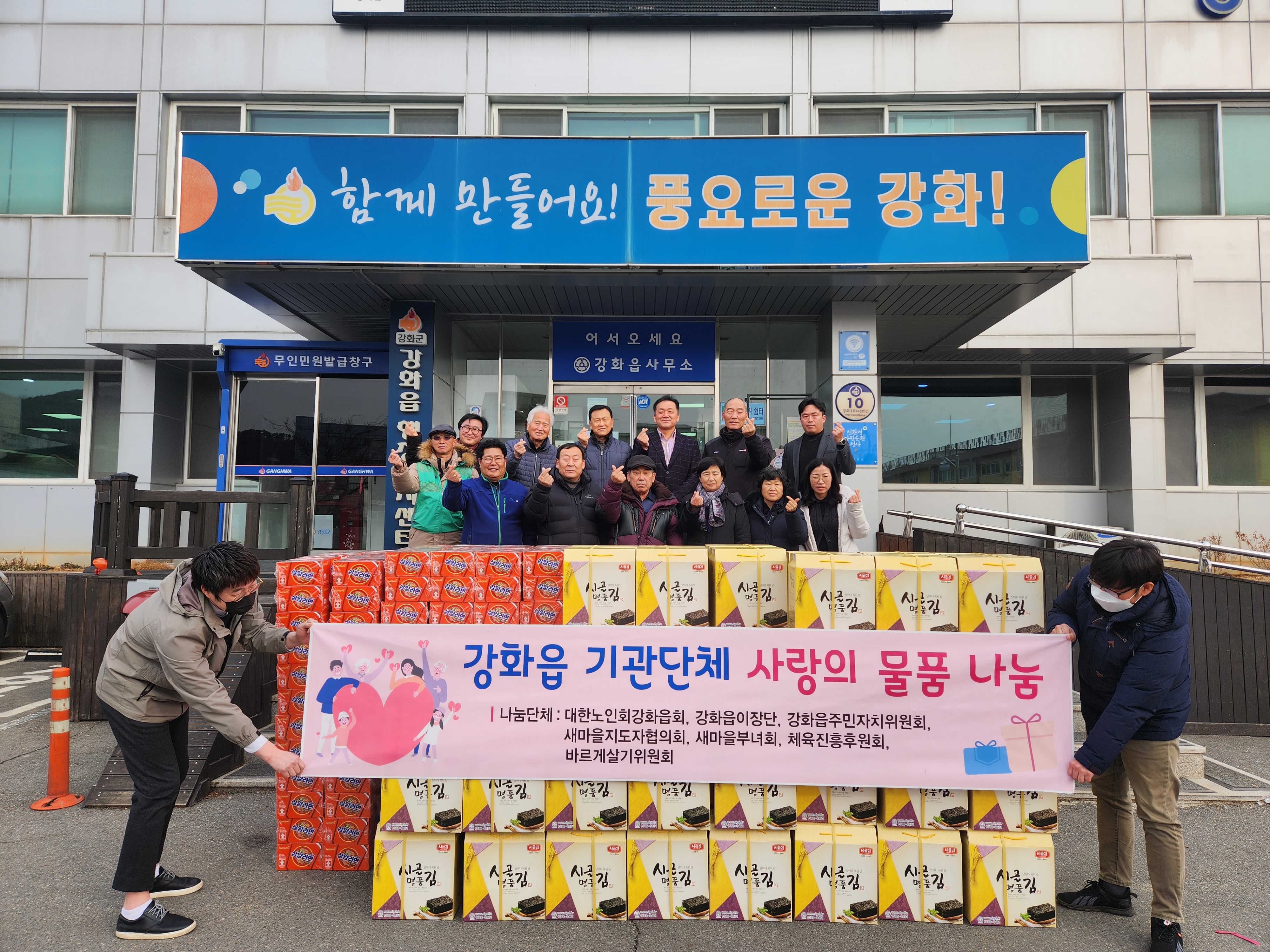 강화군 강화읍 이장단 등 7개 단체는 지난 17일 어려운 이웃들이 풍성한 명절을 보낼 수 있도록 김(216박스)과 라면(200박스) 등 500만 원 상당의 물품을 마련해 전달했다.