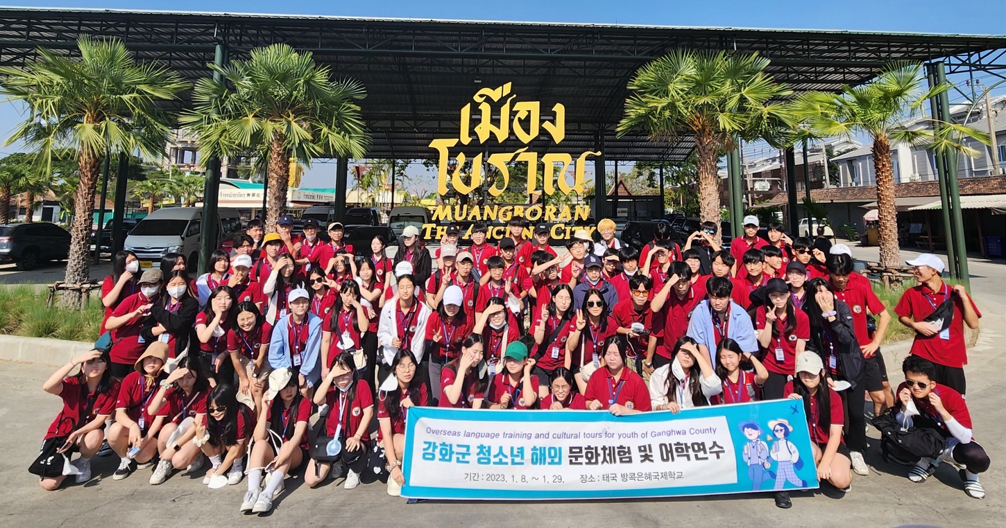 ‘강화군 청소년 해외문화체험 및 어학연수단’은 지난 8일 출국해 오는 28일까지 3주간 공식일정을 소화하고 있다. 이번 연수단은 관내 중‧고등학교 80명 규모로 태국 방콕의 은혜국제학교에서 원어민 교사들의 지도 아래 어학연수 및 문화체험에 참여하게 된다. 이번 어학연수 대상자로 선정된 학생들은 강화읍에 소재한 중·고등학교에서 추천을 받은 학생들로 군은 교육비 및 경비 90%를 지원했다.