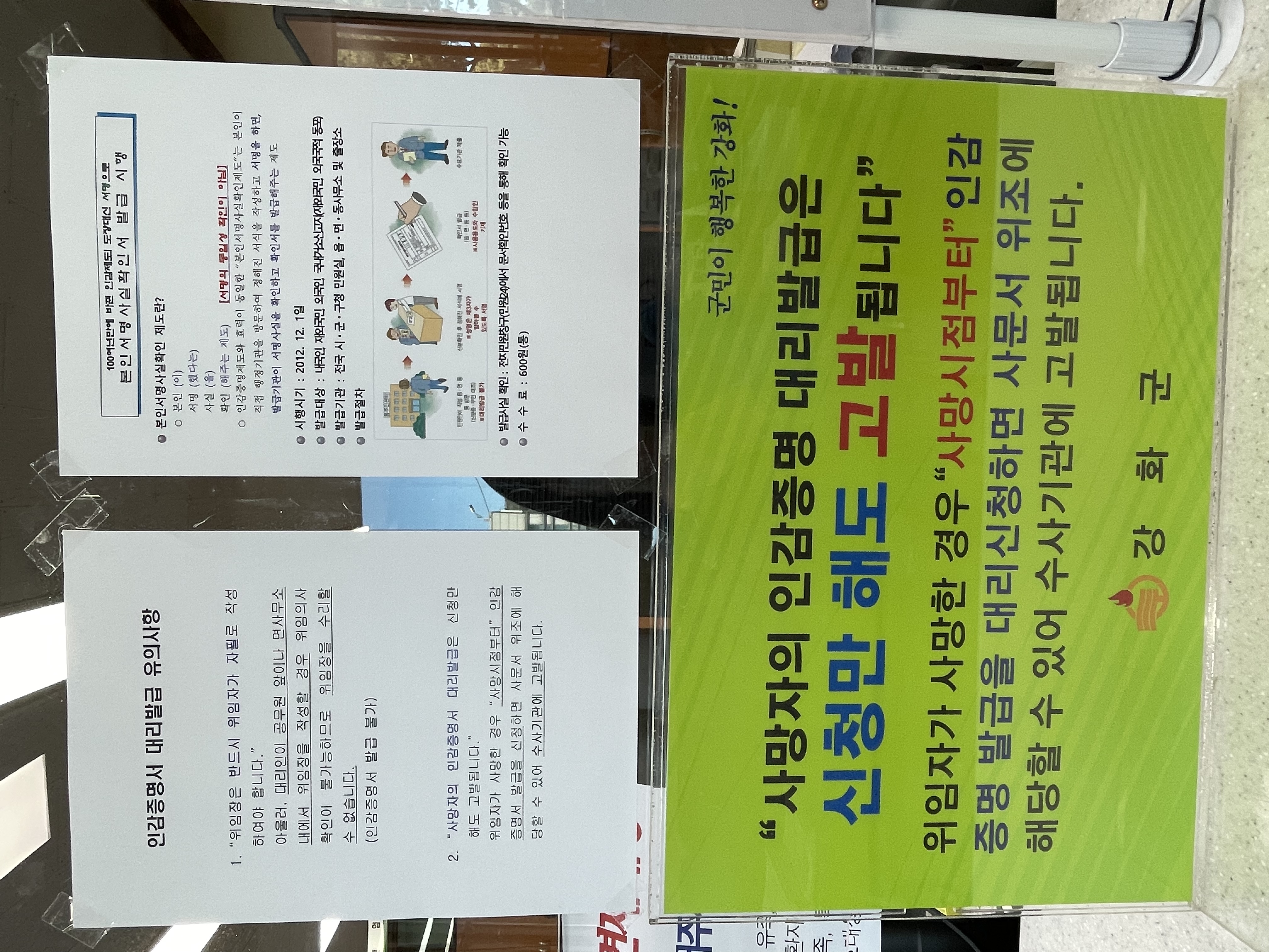 박수연 면장은 “이번 전수조사로 사망자 인감증명서 발급에 대한 경각심을 높이고, 부정발급이 발생하지 않도록 더욱 주의를 기울일 것”이라며 “인감증명서와 동일한 효력을 가진 본인서명사실확인서 제도를 적극 홍보해 인감 대리발급으로 인해 발생하는 문제를 사전에 방지하겠다”고 밝혔다