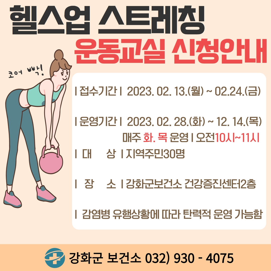 강화군(군수 유천호)은 오는 27일부터 건강한 여가생활을 위한 운동교실을 운영한다고 밝혔다.