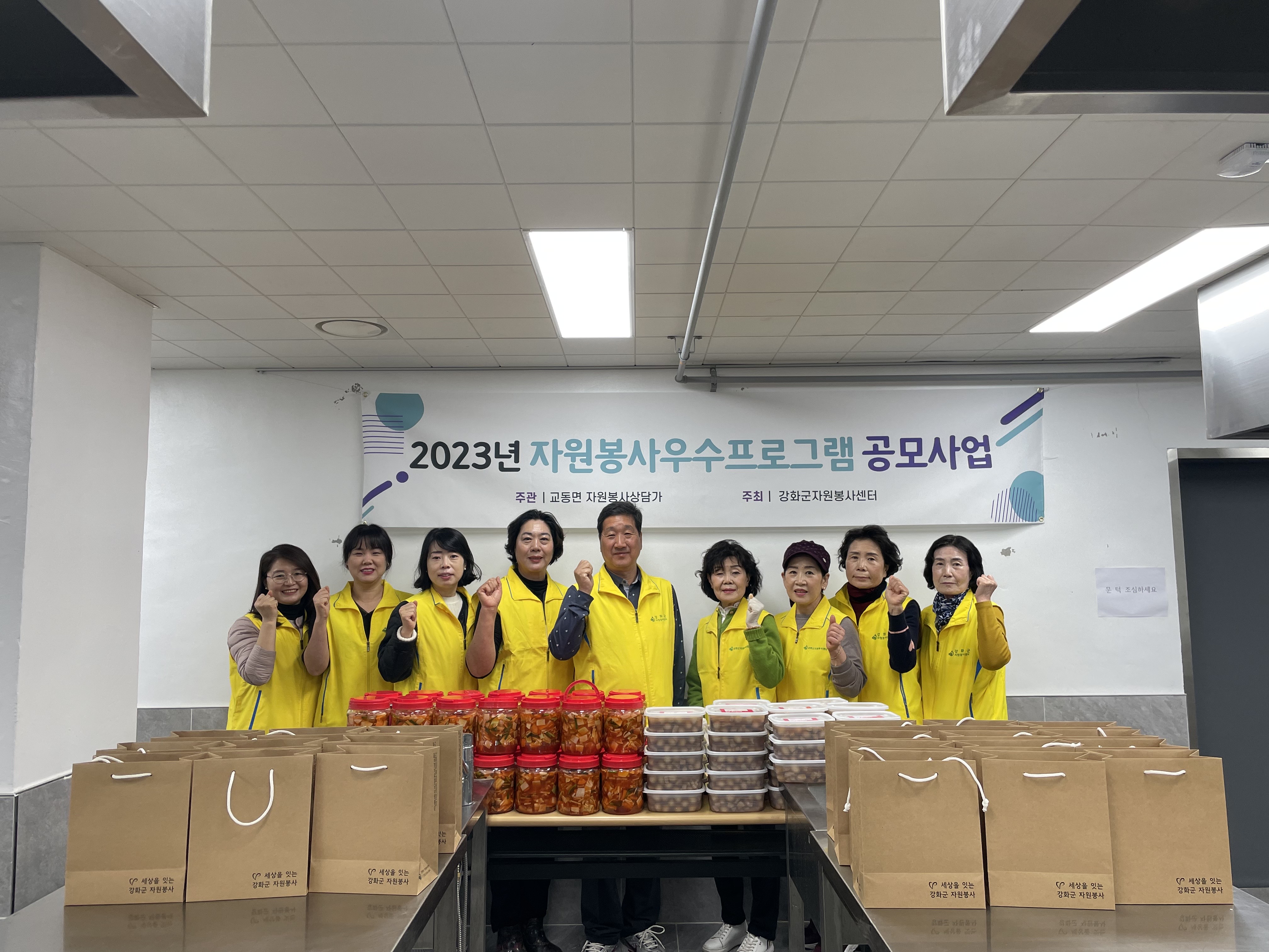 이번 활동은 자원봉사센터에서 주관한 우수프로그램 공모 사업으로 선정된 프로그램으로 교동면에 홀로 거주하고 계신 독거어르신 등의 취약계층 40가구를 대상으로 돼지고기 장조림과 물김치를 정성껏 조리하여 배부했다.