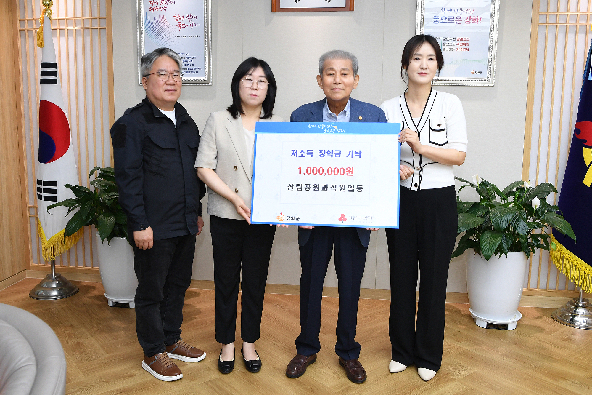 강화군 산림공원과 직원들이 저소득 학생을 위한 장학금 100만 원을 기탁했다.