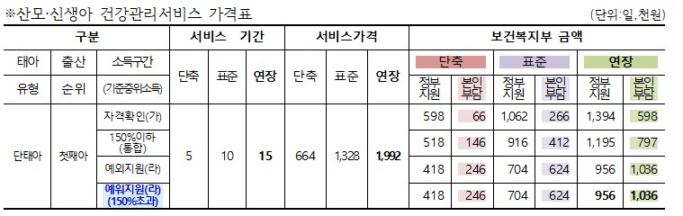 산모·신생아 건강관리 서비스는 2006년에 제도를 도입해 전국가구 월평균 소득 50% 이하로 시작한 이래, 2020년부터는 기준중위소득 120% 이하로 확대되었다. 2021년 5월부터 현재까지 출산가정의 경제적 부담 완화 등 출산 지원 강화를 위해 지원 대상을 150% 이하로 확대 지원하고 있다.