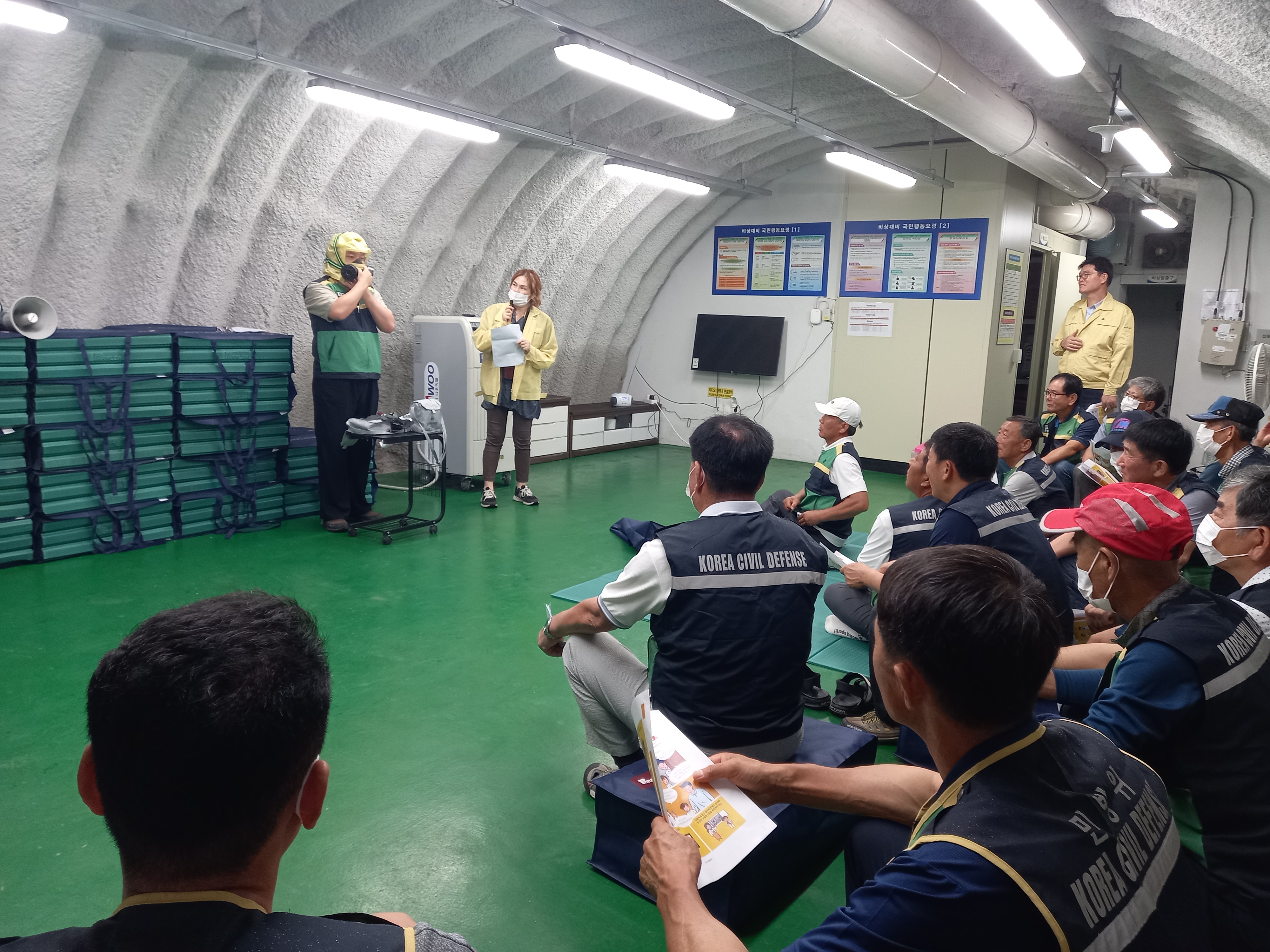 또한, 14시 공습경보 발령 시에는 연막탄 발화로 지역주민, 공무원, 민방위대장 등 30여 명이 주민대피시설로 신속하게 대피해 실제 재난 상황을 방불케 했다. 이후에는 비상시 국민 행동 요령과 방독면 착용 훈련을 병행해 공습 상황에 대비한 대피 방법과 행동 요령을 익히는 소중한 시간을 가졌다.