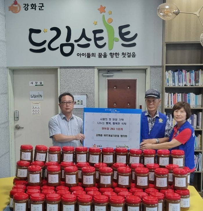 바르게살기 강화읍위원회(회장 차대성)는 지난 19일 강화군 사회복지과 드림스타트팀을 방문해 맛된장 2kg 100통을 후원했다.