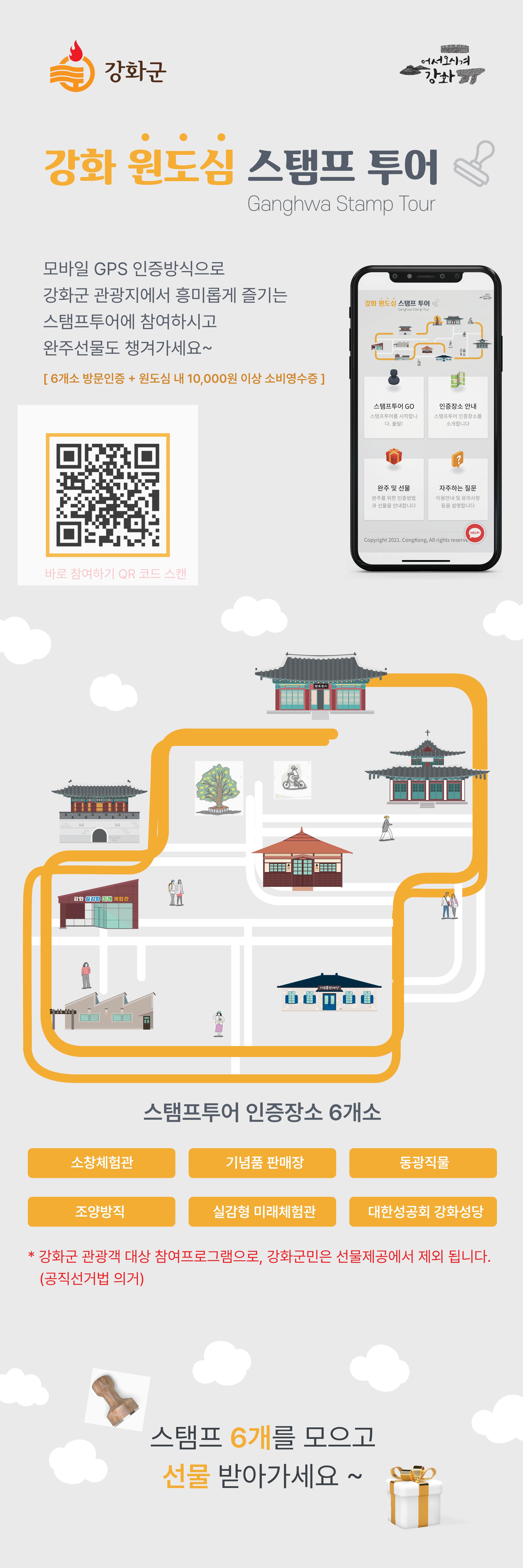 ‘강화 원도심 스탬프 투어’는 GPS 인증 기반의 모바일 웹을 활용해 원도심의 관광지를 돌아볼 수 있도록 동선을 고려해 설계되어, 이를 통해 강화읍 원도심을 천천히 걸으며 원도심만의 매력을 느끼고 즐길 수 있다.