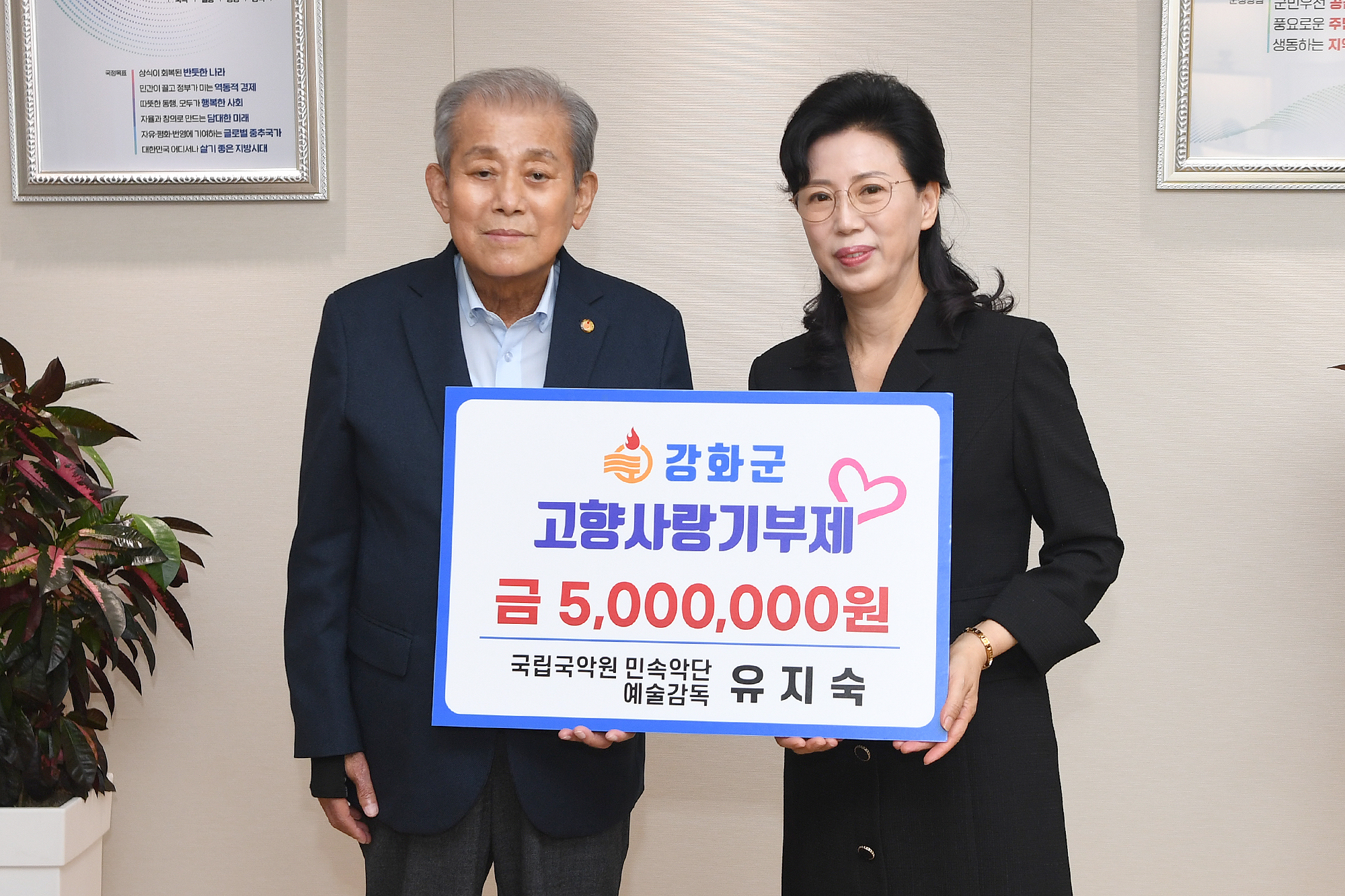 강화군(군수 유천호)은 19일, 국립국악원 민속악단 예술감독 유지숙 명창이 고향사랑 기부금 연간 최고 금액인 500만 원을 기부하며 고액 기부 행렬에 동참했다고 전했다.