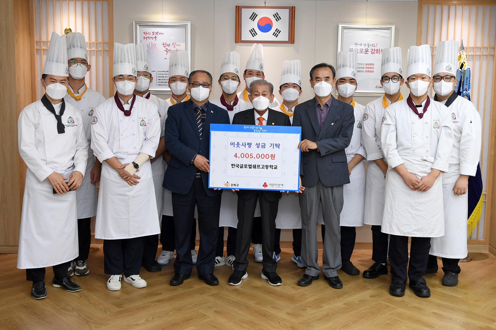 강화군(군수 유천호)은 지난 10월 용흥궁공원 일원에서 개최된 ‘2023년 강화문화재야행(夜行)’ 행사에 참여한 한국글로벌셰프고등학교 학생들이 음식 판매로 얻은 수익금 4백만5천원 전액을 기탁했다고 2일 밝혔다.