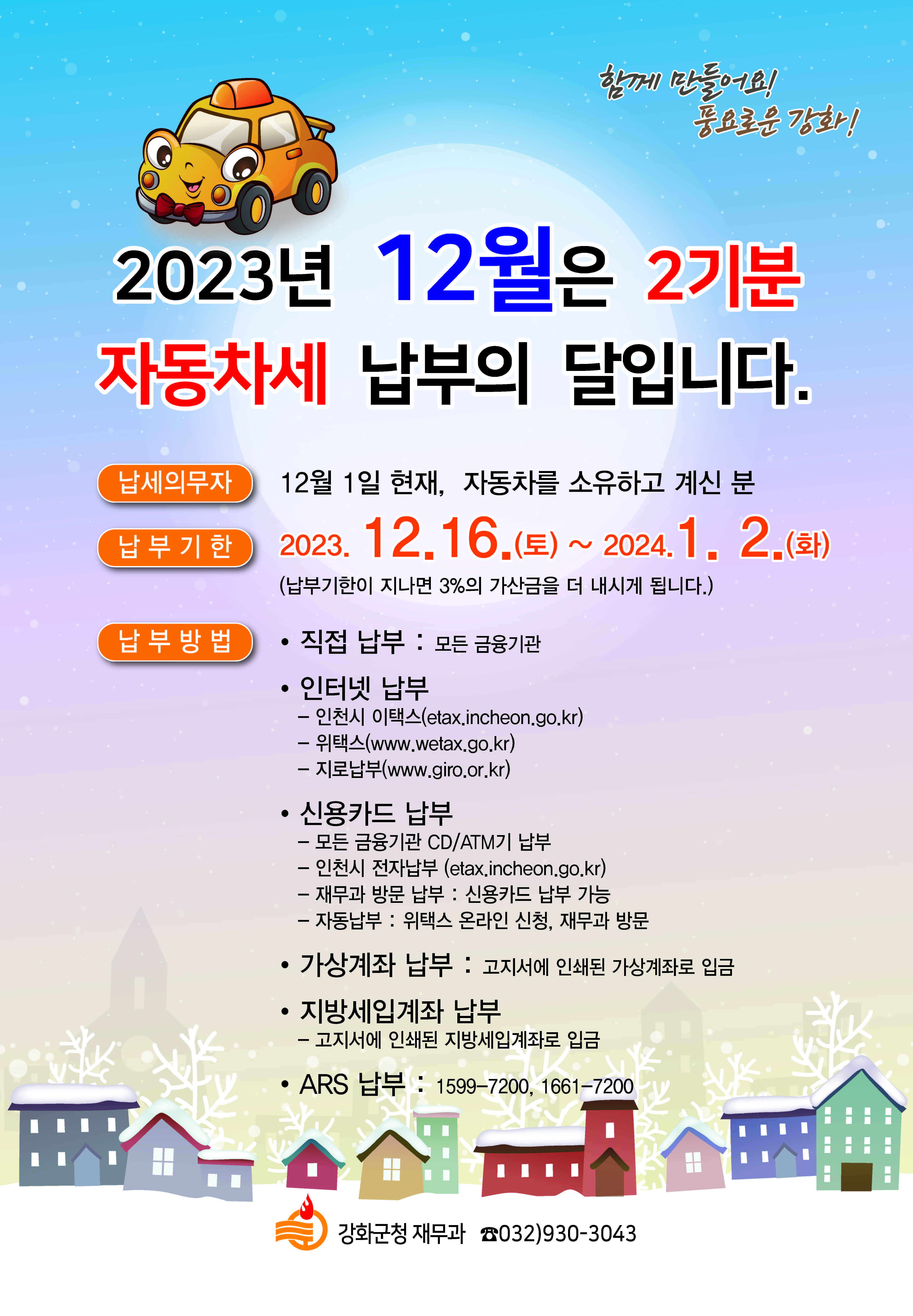자동차세 납부와 관련해 궁금한 사항은 강화군청 재무과(☎930-3043)로 문의하면 된다.