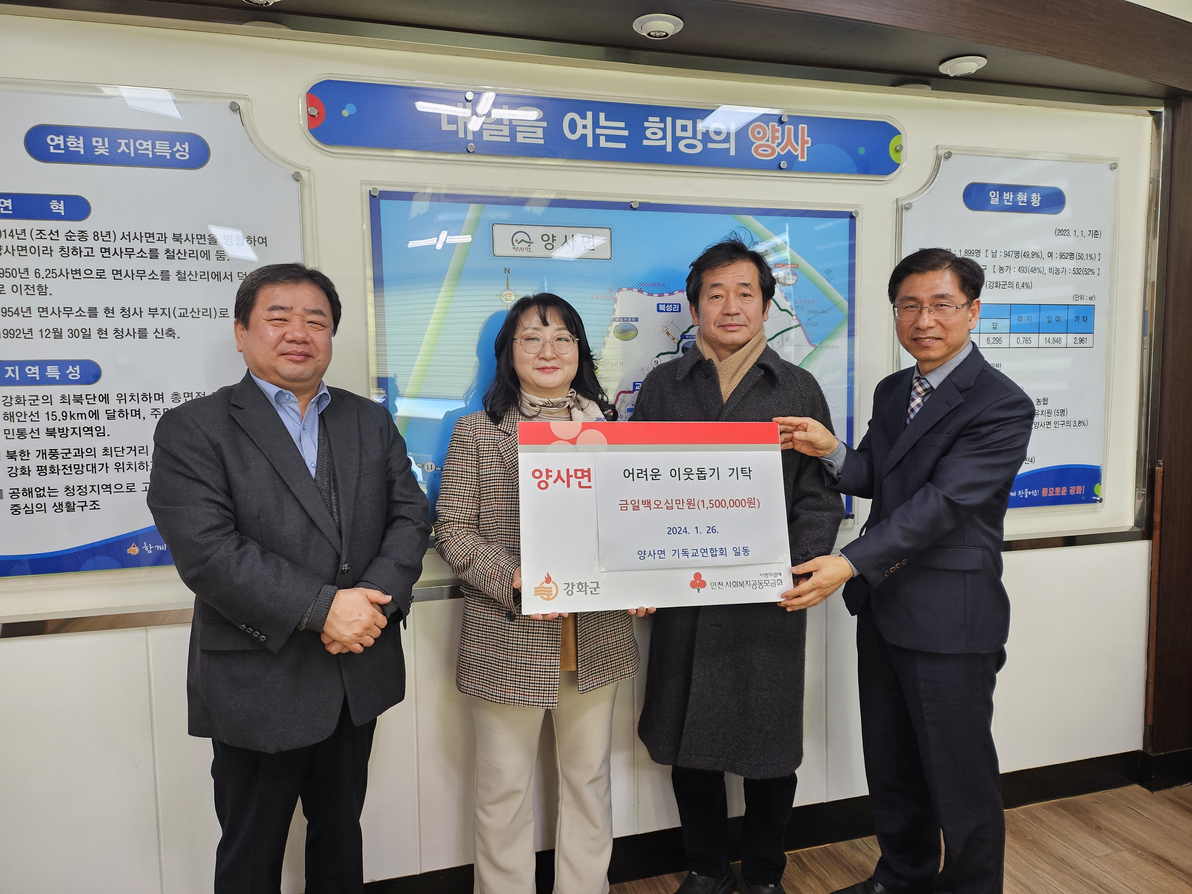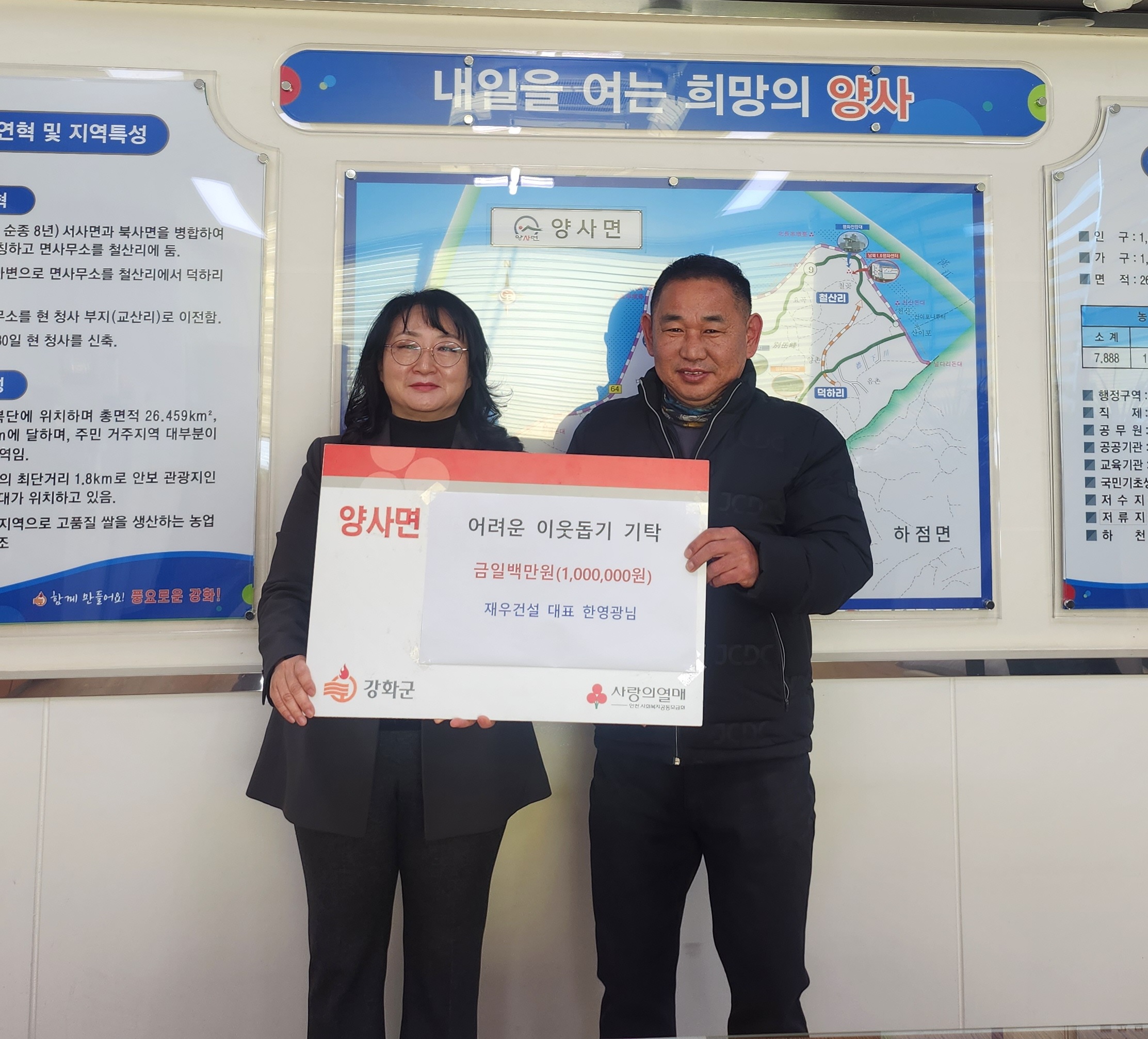 강화군 양사면 기독교연합회(목사 김선민)와 ㈜재우건설(대표 한영광)에서 어려운 이웃 돕기 성금 150만 원과 100만 원을 각각 양사면에 지정 기탁했다.