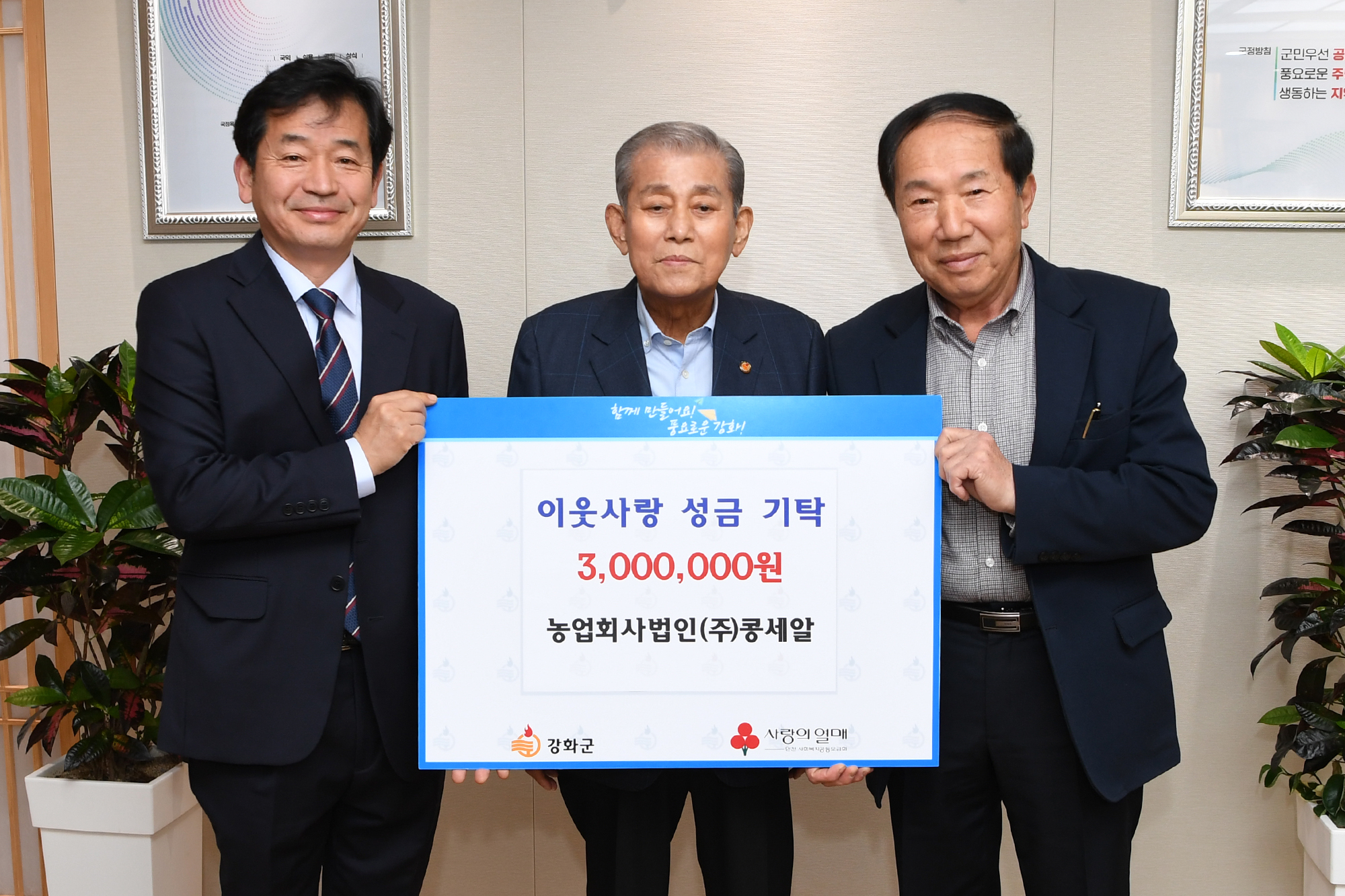 강화군 양사면 기업·단체들이 어려운 이웃을 위한 성금 기탁식을 가졌다. 지난 15일에는 양사면 농업회사법인 ㈜콩세알(대표 서정훈)에서 이웃돕기 성금으로 300만 원을 기탁했으며, 지역사회보장협의체(위원장 이규숙)가 사회복지공동모금회를 통해 100만 원을 강화군에 지정 기탁했다.