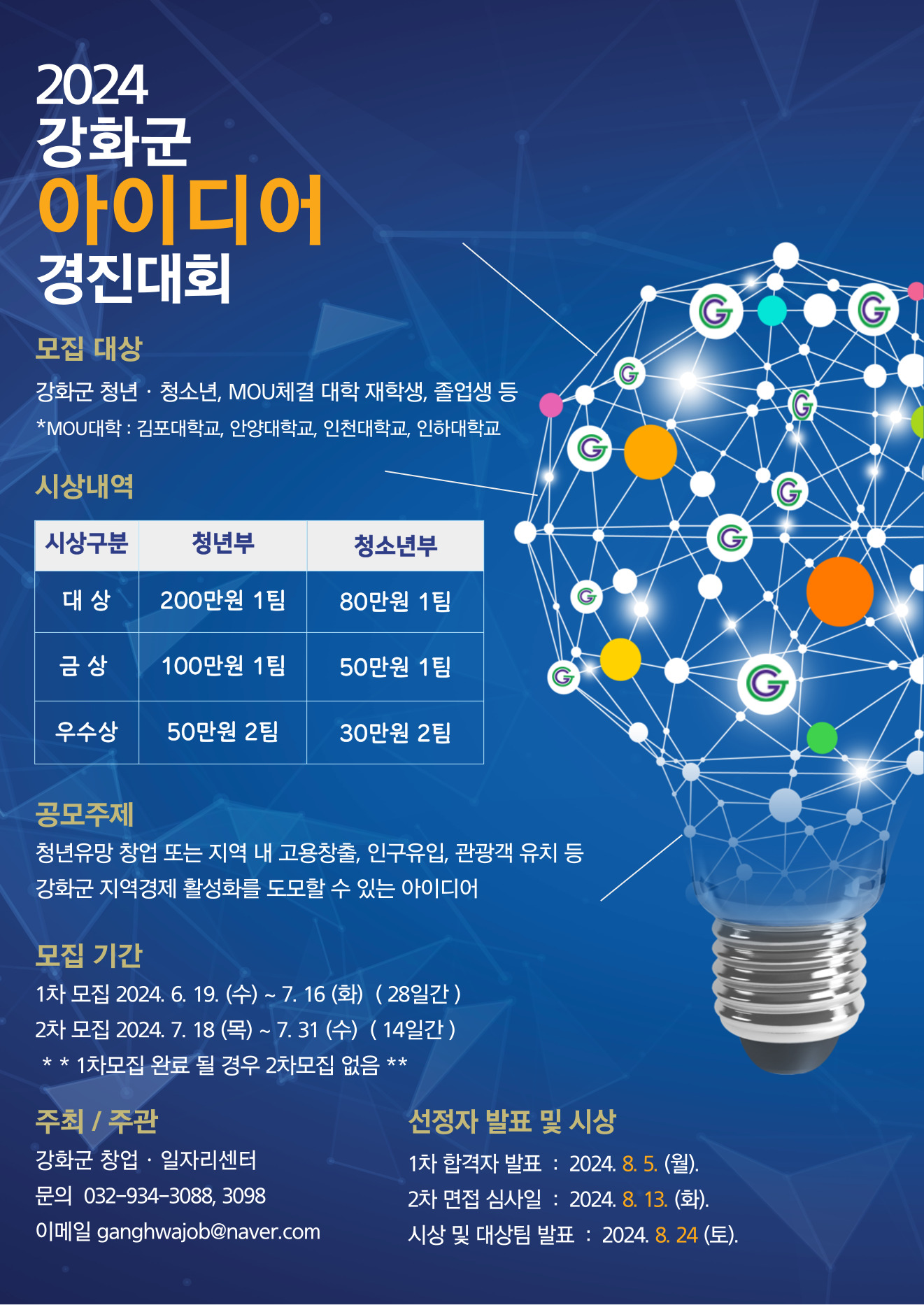 시상 규모는 청년부 ▲대상(1팀) 200만 원 ▲금상(1팀) 100만 원 ▲우수상(2팀) 각 50만 원이며, 청소년부는 ▲대상(1팀) 80만 원 ▲금상(1팀) 50만 원 ▲우수상(2팀) 각 30만 원이다.