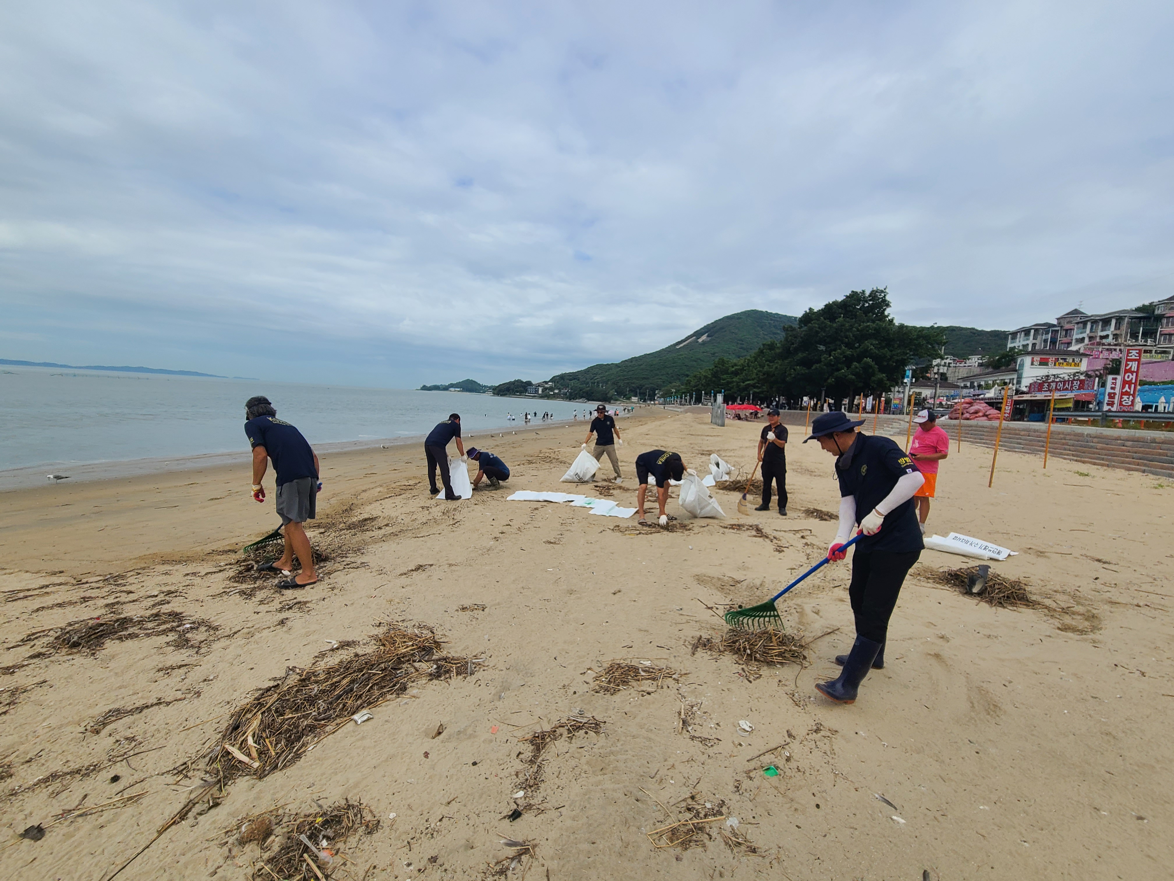 이날 동막자율방범대 대원 20여 명은 아침 일찍부터 모여 장맛비로 인해 밀려온 초목류, 폐어구, 캔, 유리병 등 각종 해안 쓰레기를 수거했다.