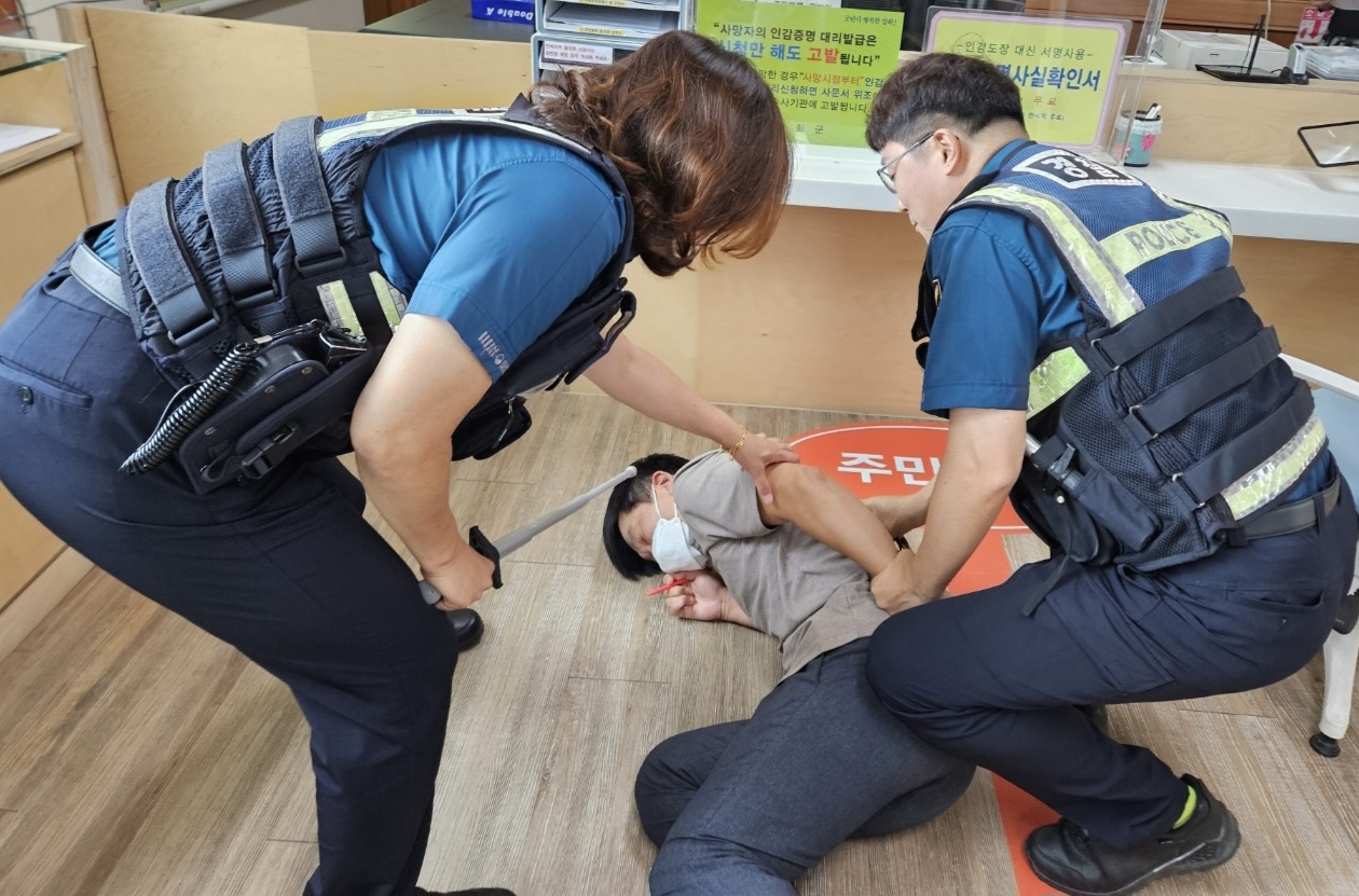 양사파출소와 합동으로 진행한 훈련은 적법한 민원처리 결과에 불만을 품은 악성 민원인이 민원실로 찾아와 난동을 피운다는 가상의 시나리오를 바탕으로 공직자 민원 응대 매뉴얼에 따라 실시했다.