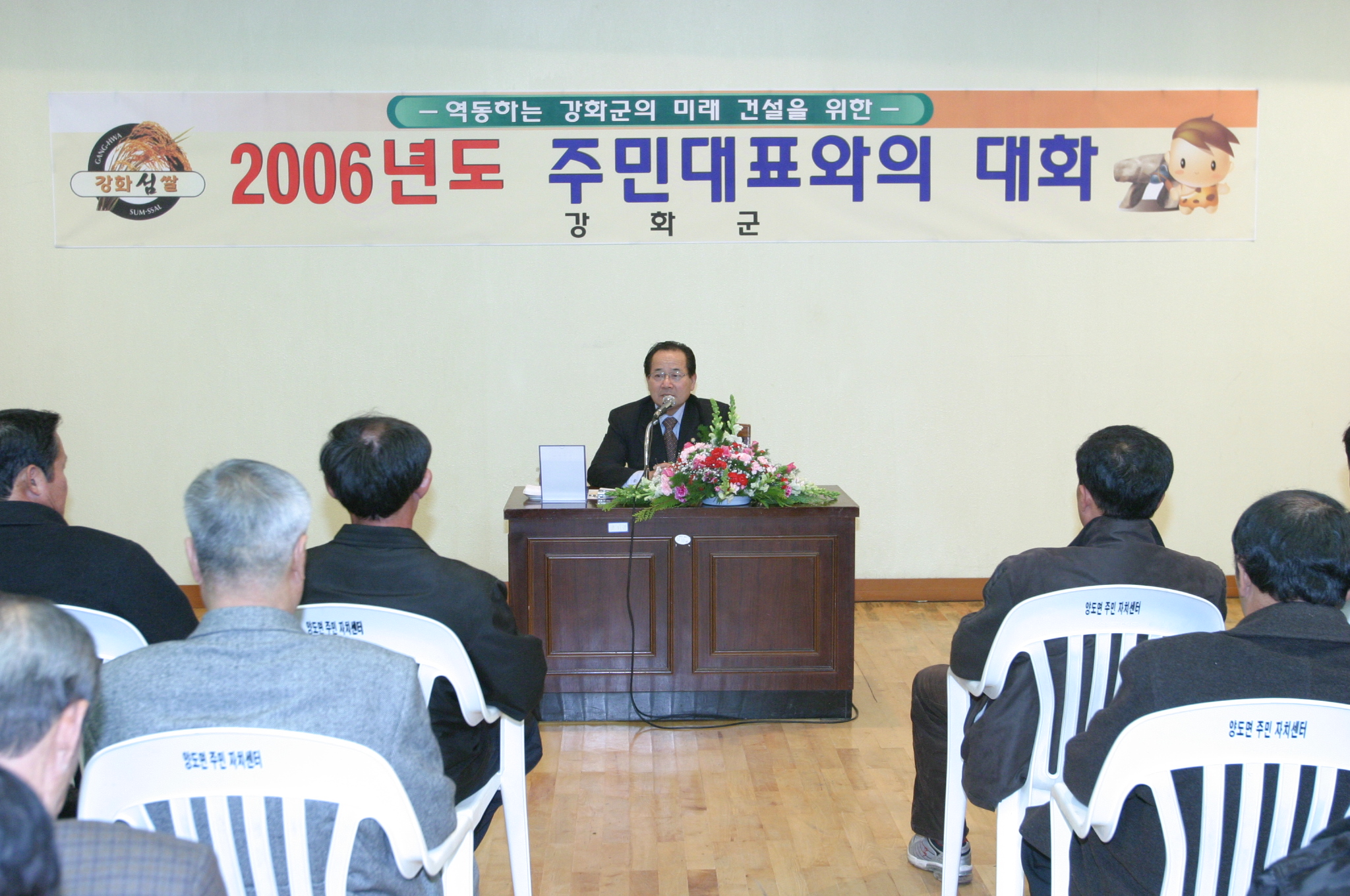 주민대표와 대화, 건의사항 수렴 강화군, 오는 2월7일까지 13개읍면 강화군은 2006년 새해를 맞아 17일 양도면을 시작으로 유병호 군수를 비롯한 관계공무원, 주민대표, 언론인 등이 참석한 가운데 군수 읍면 연두방문 주민대표와의 대화시간을 가졌다. 올해 연두방문은 작년과는 달리 공직선거법과 관련해 참석자에 대한 다과뿐만 아니라 불우이웃 및 격무부서(지구대, 파출소, 해경초소) 근무자에게 위문품 등을 제공할 수 없게 되어 양도면장으로부터 현안사항 보고를 청취하고, 1시간30여분 동안 주민대화 시간을 가졌다. 유병호 군수는 인사말을 통해 지난 한해 열심히 군정을 펼 수 있도록 협조하여 주신데 대해 감사하며, 지방자치는 주민들의 적극적인 참여로 만들어진다.고 강조하면서 지역주민과 지역발전방안에 대한 논의와 폭 넓은 대화를 위주로 지역의 민원사항을 청취했다. 군에서는 읍면 주민과의 대화를 17일부터 2월7일까지 유병호 군수를 비롯한 각 실과 간부 공무원들과 함께 주민과의 대화에 나설 예정이며, 이를 통해 주민본위의 봉사행정 및 역동하는 깨끗한 군정, 희망찬 새강화 건설을 위한 기초자료로 활용할 방침이다.