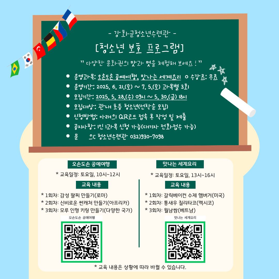 자세한 내용은 강화군시설관리공단 홈페이지(www.ghss.or.kr)를 확인하거나 청소년수련관(☎032-930-7098)으로 문의하면 된다.