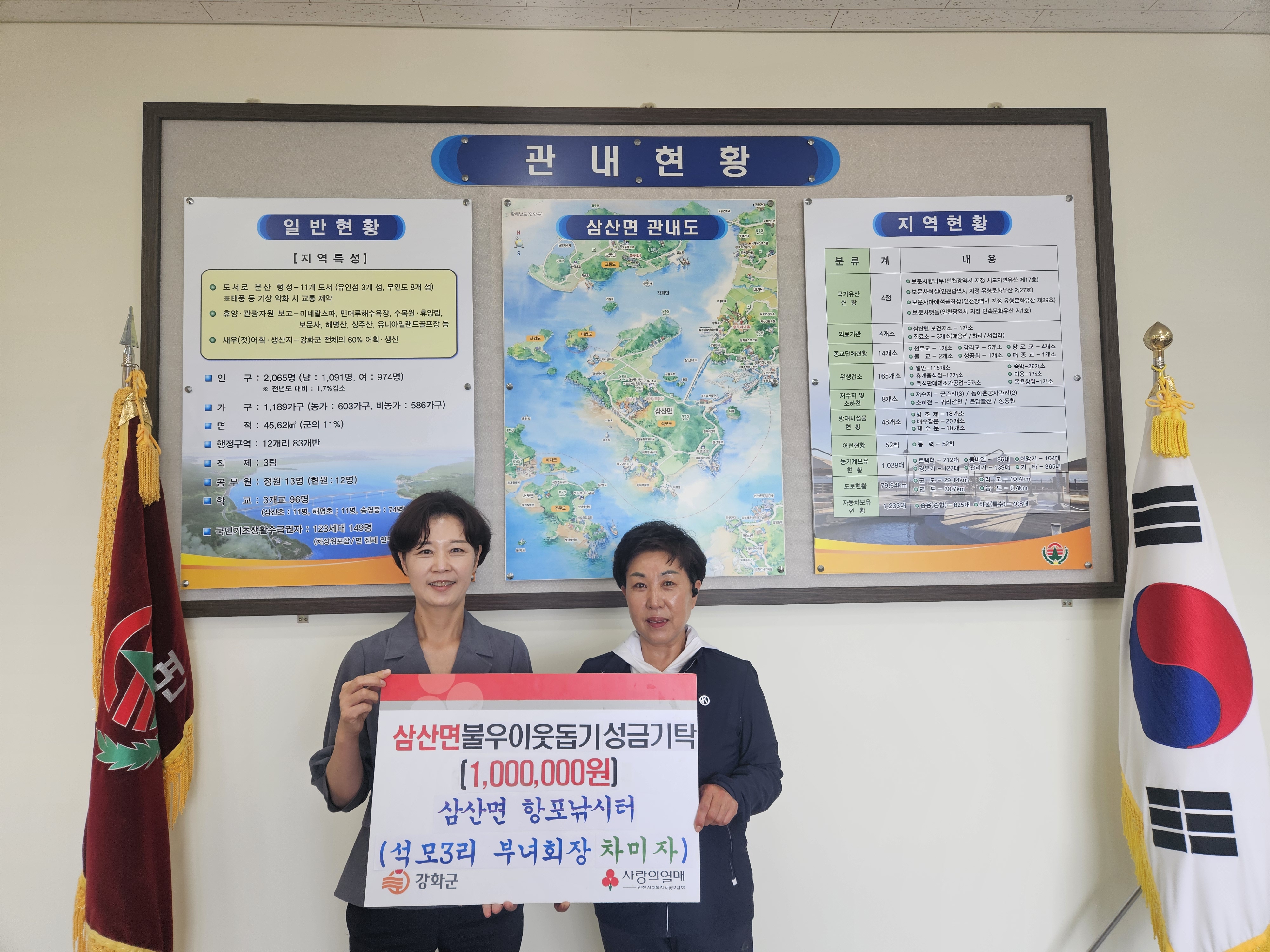 강화군 삼산면(면장 고영자)은 지난 18일, 항포낚시터를 운영 중인 석모3리 부녀회장(차미자)이 관내 어려운 이웃을 위한 성금 100만 원을 기탁했다고 전했다.