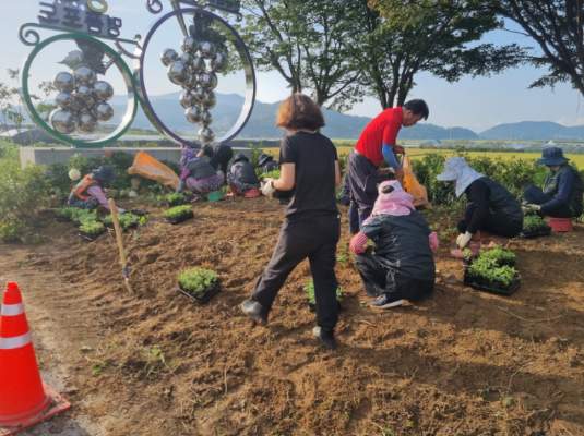 강화군 양도면 주민자치위원회(위원장 김혜경)가 지난 15일, 길정리 포도 조형물 가로화단에 가을꽃을 식재했다고 밝혔다.