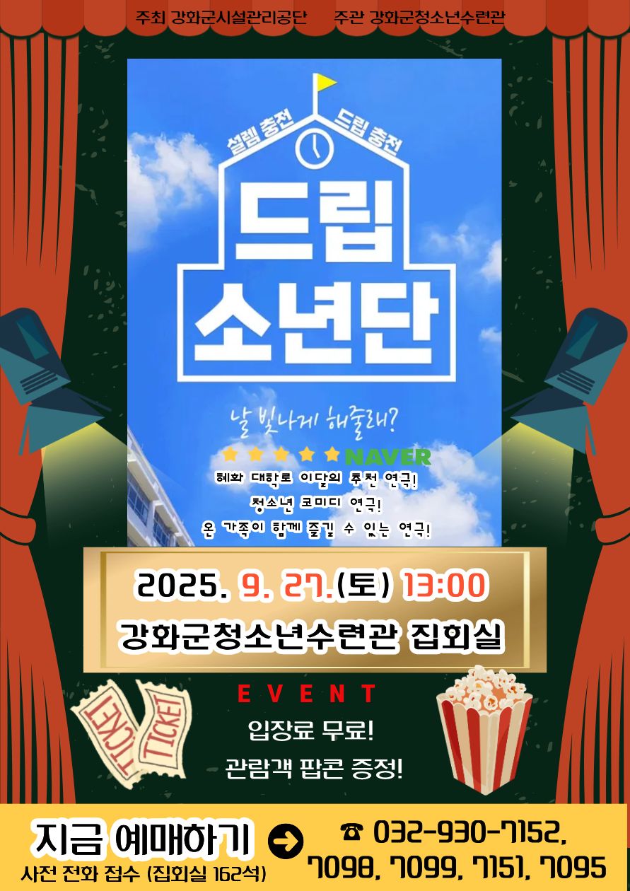강화군시설관리공단(이사장 박영길) 청소년수련관이 오는 27일 오후 1시, 청소년수련관 집회실에서 청소년 진로 탐색 연극 <드립소년단> 초청 공연을 개최한다.