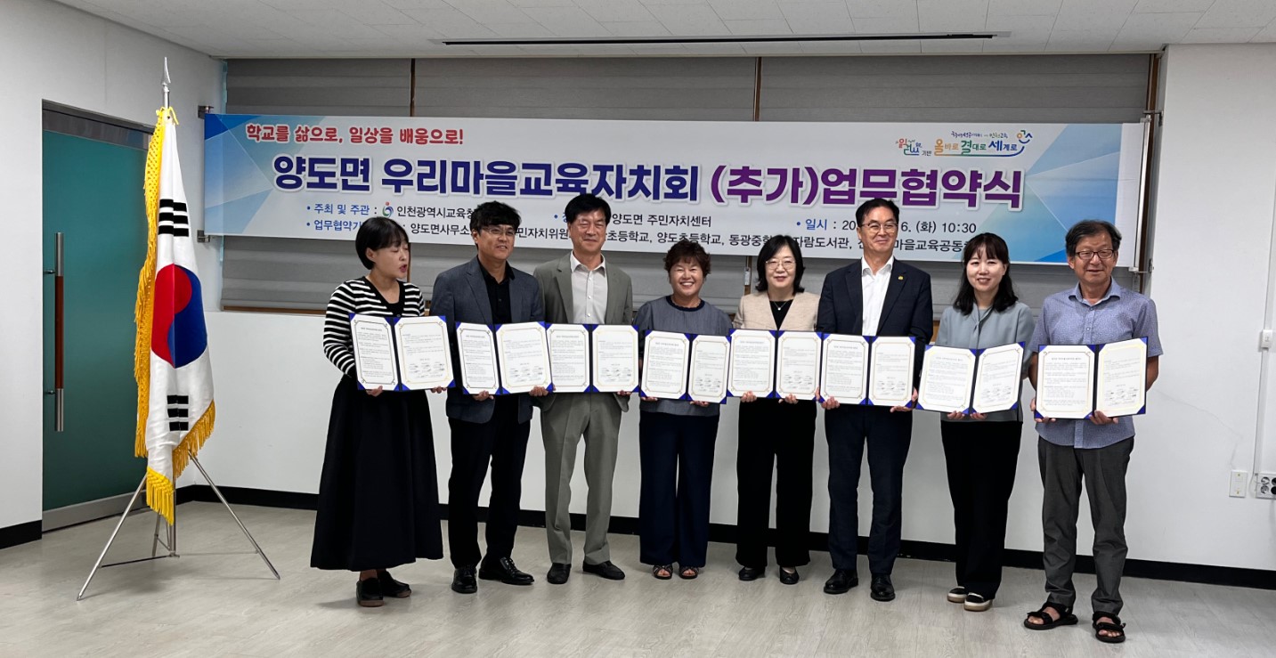 강화군 양도면(면장 조현미)과 양도면 주민자치위원회(위원장 김혜경)는 지난 16일, 양도면 우리 마을 교육자치회의 추가 업무협약을 체결했다고 밝혔다.