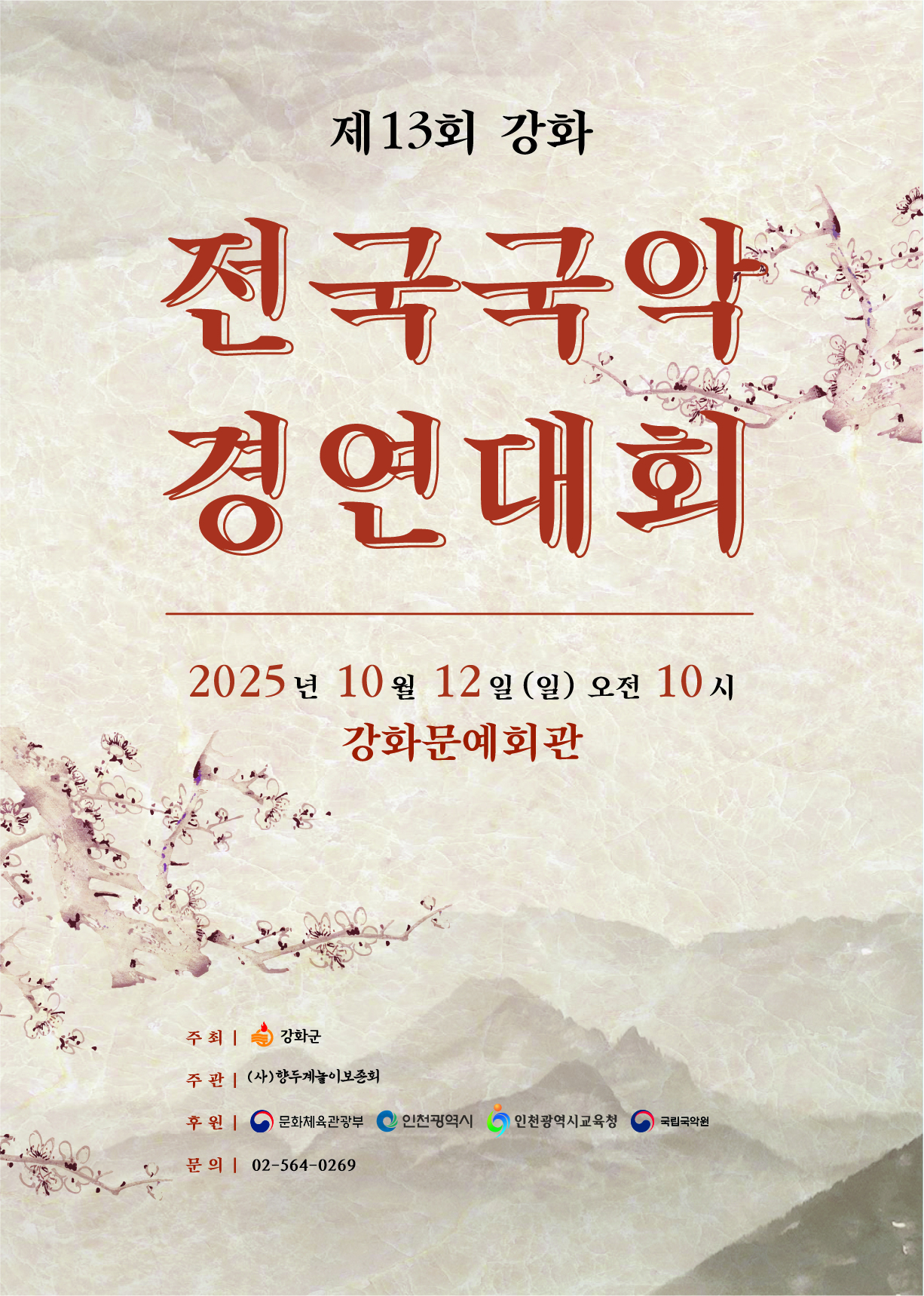 강화군(군수 박용철)은 오는 10월 12일 강화문예회관에서 ‘제13회 강화 전국 국악경연대회’를 개최한다고 밝혔다.