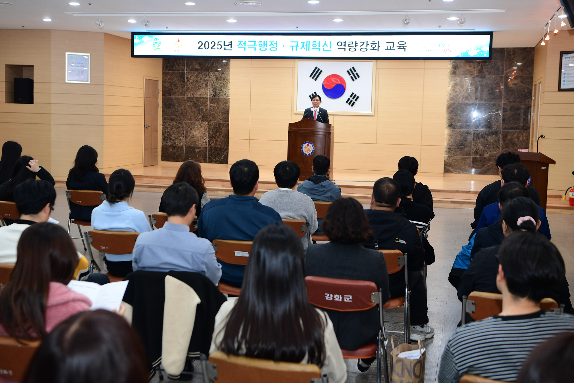 강화군(군수 박용철)이 지난 12일, 군청 4층 진달래홀에서 전 직원을 대상으로 ‘2025년 적극행정·규제혁신 역량 강화 교육’을 실시했다.